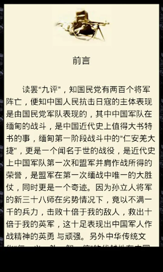 中国人民抗击日寇的主体表现是由国民党军队表现的,其中中国军队在缅甸的战斗,是中国近代史上值得大书特书的事,缅甸第一阶段战斗中的“仁安羌大捷”,更是一个闻名于世的战役,是近代史上中国军队第一次和盟军并肩作战所得的荣誉,是盟军在第一次缅战中唯一的大胜仗,同时更是一个奇迹。因为孙立人将军的新三十八师在劣势情况下,竟以不满一千的兵力,击败十倍于我的敌人,救出十倍于我的英军,这十足表现出中国军人作战精神的英勇 与顽强。另外中华传统文化“仁、义、礼、智、信”的优越性在中国军队的对日作战中,以缅甸之战体现的相当淋漓尽致。