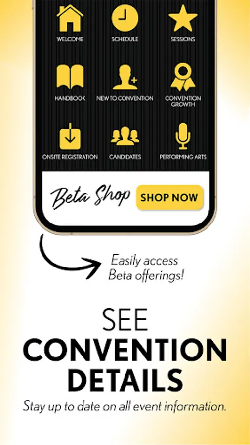 * State Convention – Gain quick access to Convention details such as schedules, general session agendas, voting portals, polls, exclusive Beta Shop deals and more.