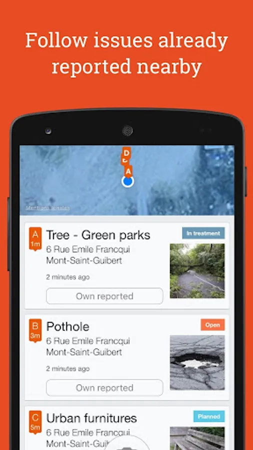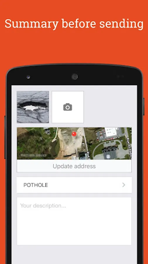 Take a photo, tag it with the right category, add an optionnal comment and that is it. Just click « Send ». The photo will automatically geo-localized via the GPS of your smartphone.
