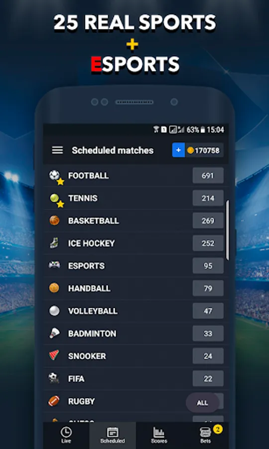 You get statistics on every match to ensure that you make accurate predictions when placing a bet. The stats contain useful information about the matches, the teams' state, progress in the last five games, number of shots per game, fouls, and squad lineups. You can place bets on upcoming matches since the app notifies you before games and provides daily tips.