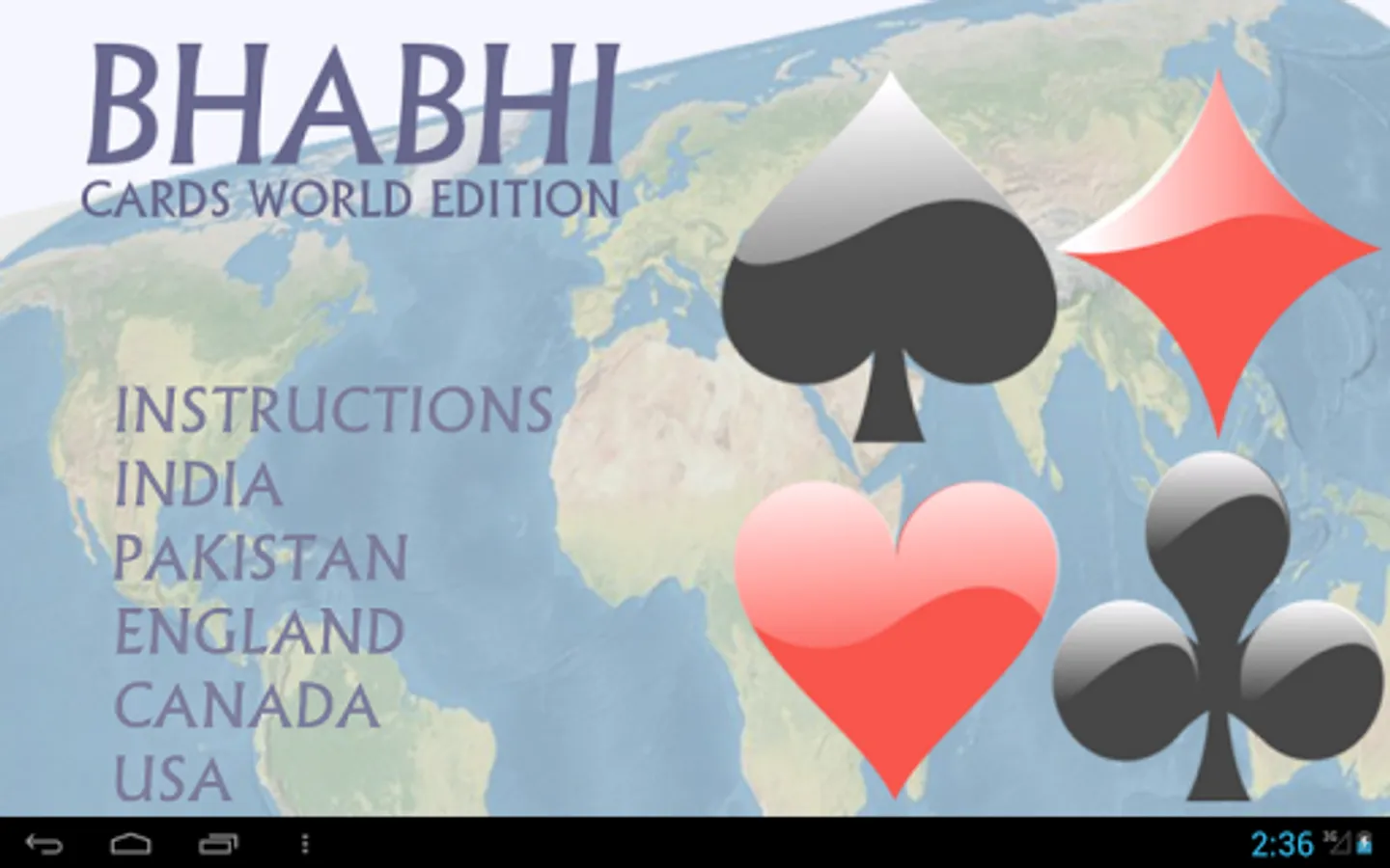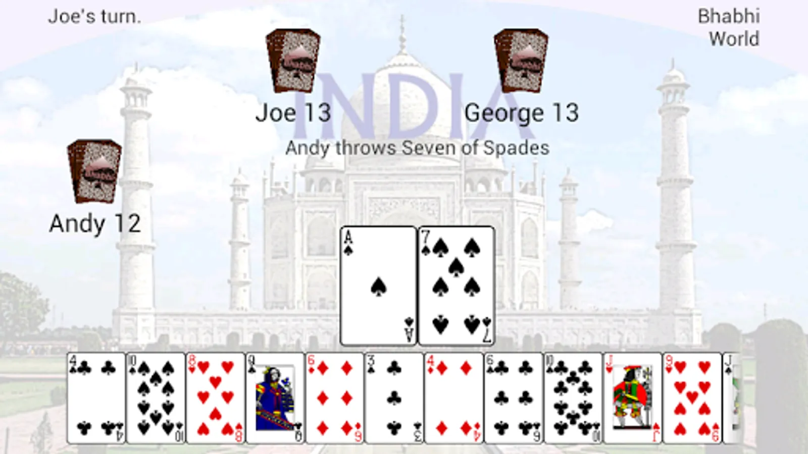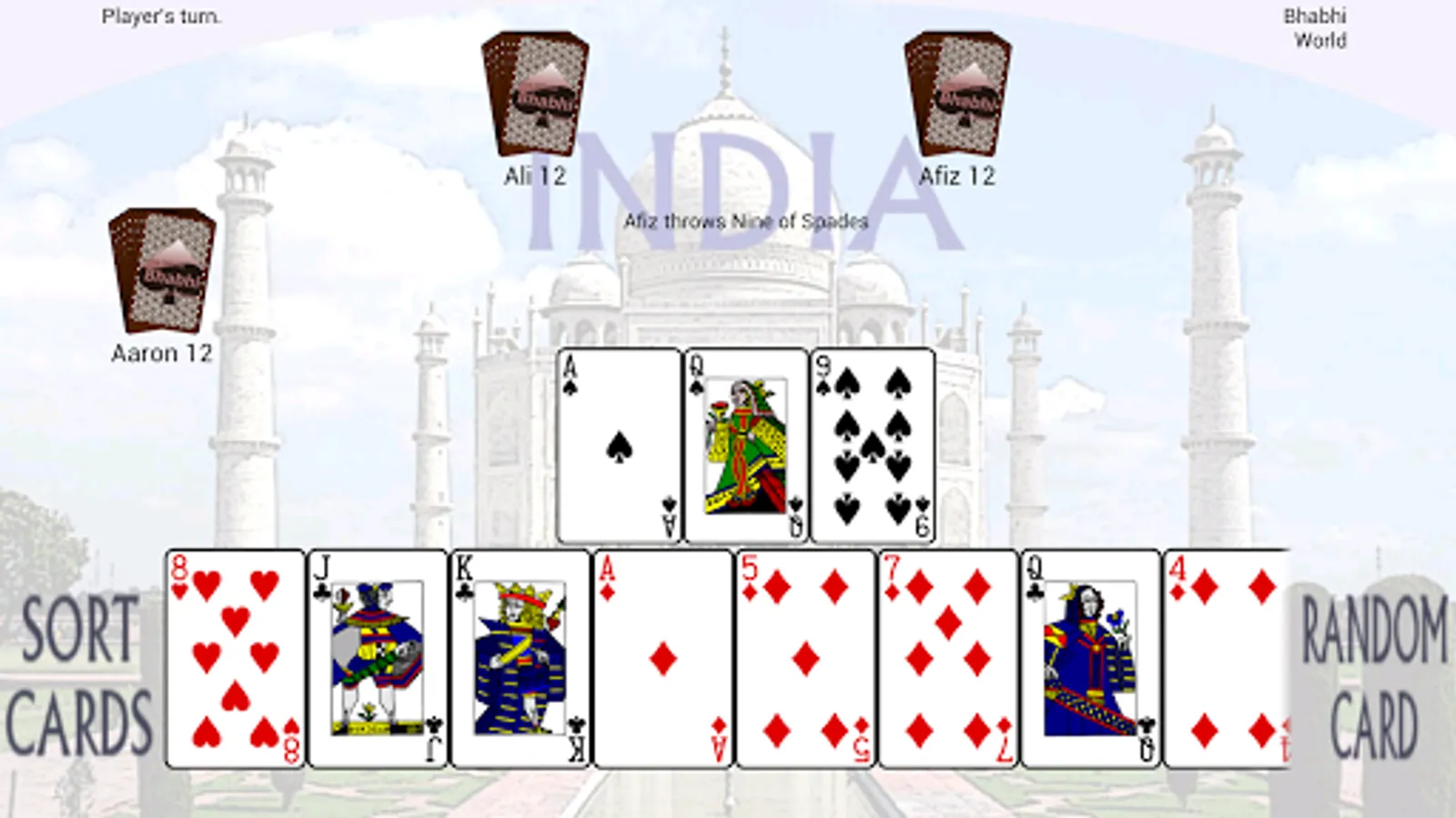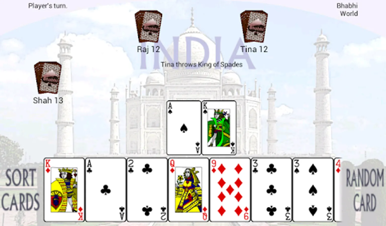 Bhabhi Cards World is a game in which players take turns trying to get rid of their cards. When they run out, they leave the table and the last one with cards is "BHABHI"