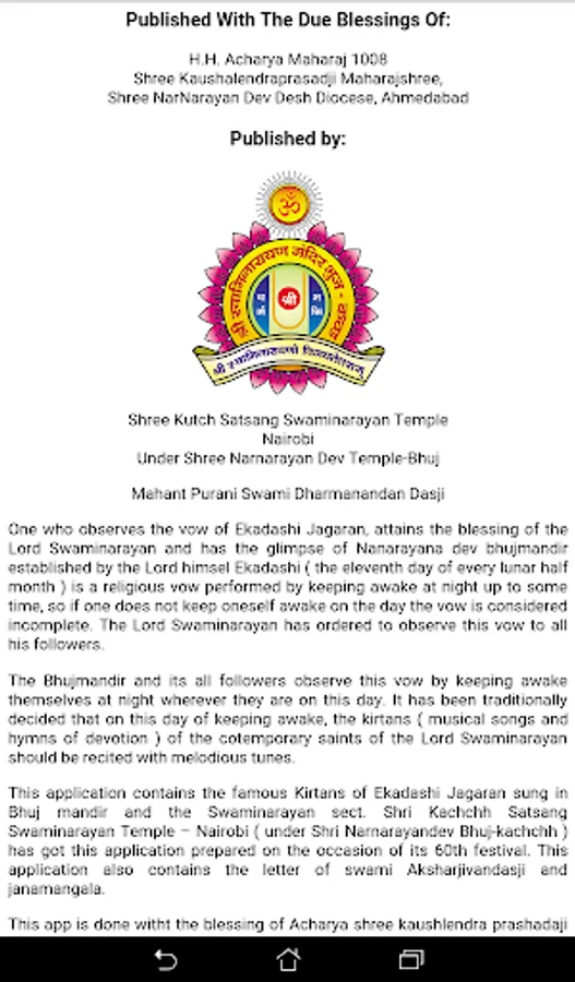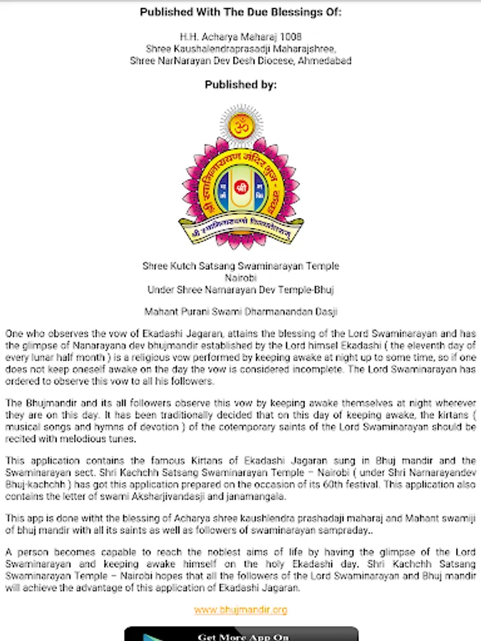 To mark the 60th celebrations of Shree Kutch Satsang Swaminarayan Temple Nairobi, the Temple is pleased to offer this app in an attempt to allow devotees to easily take part in Ekadashi Jagaran and to practice the Kirtans while on the move, at home or at the Temple. Kirtan Bhakti performed on any day is invaluable but the merits of such actions on Ekadashi are immeasurable.