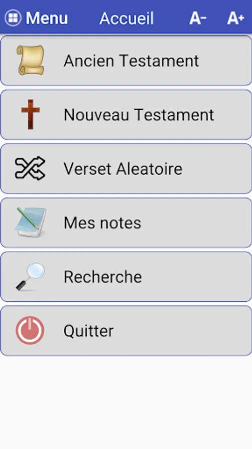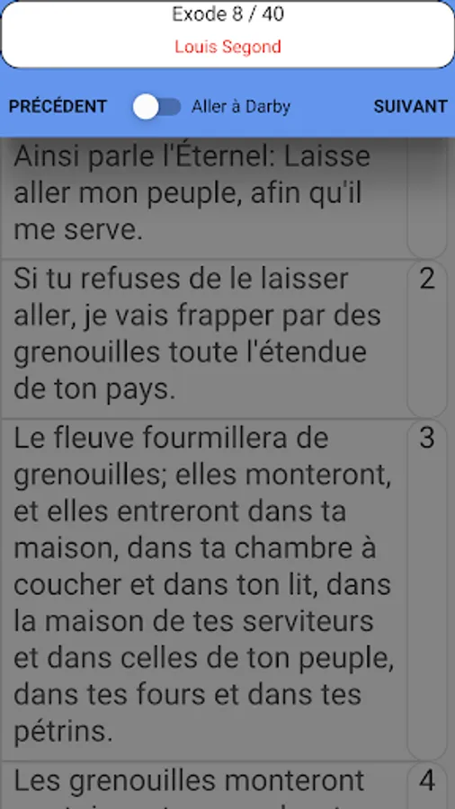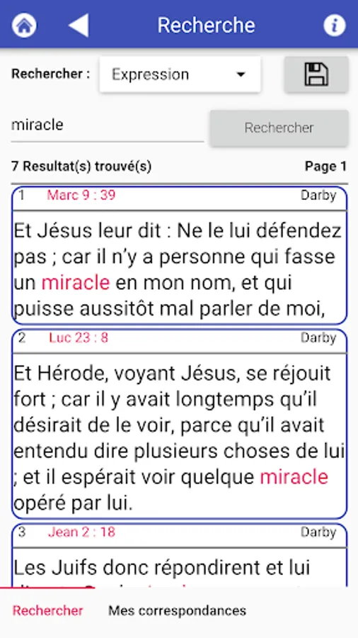 This application is a Bible research and study to compare the texts Louis Segond (1910) and Darby. Like almost all other applications in its class, this application also offers simple and advanced search functions, notes backup functions. It is also possible for saved notes to export them to Pc or just to send them to another user of the mobile application.