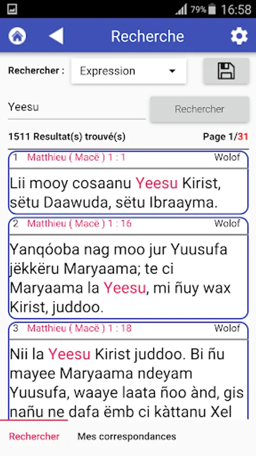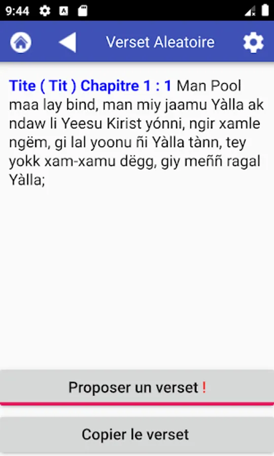 This app only contains the New Testament. It is possible to switch texts from the Wolof version to texts from the French version (Louis Second 1910).