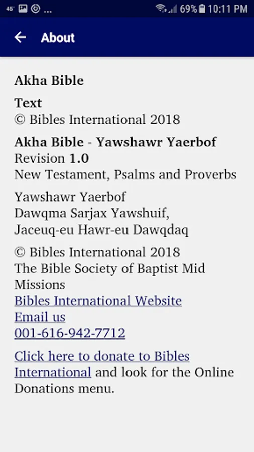 This app provides a translation of the New Testament, Psalms, and Proverbs into the Akha language. It is produced by Bibles International, the Bible society, translation and publishing department of Baptist Mid Missions.