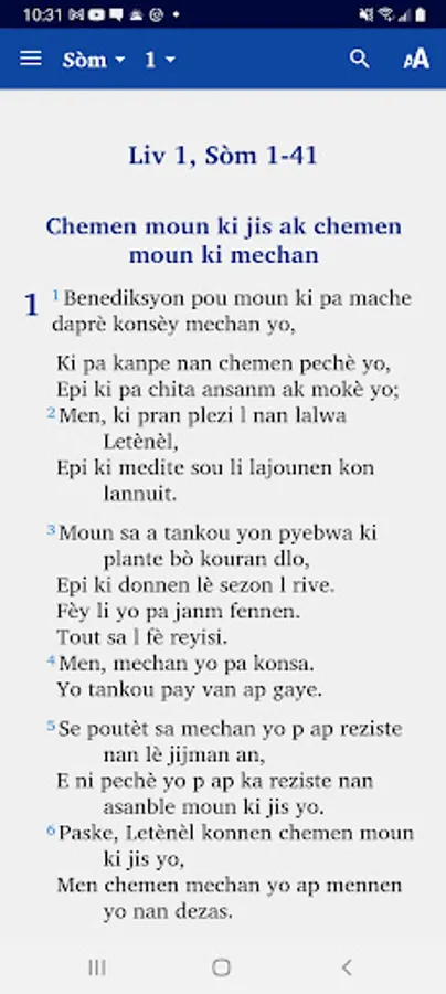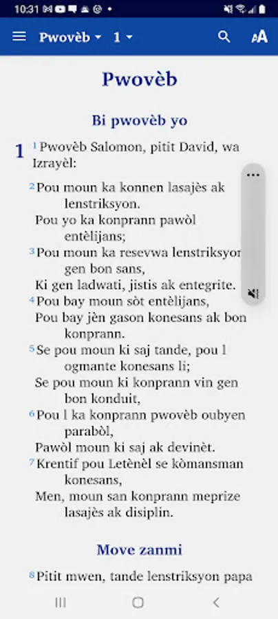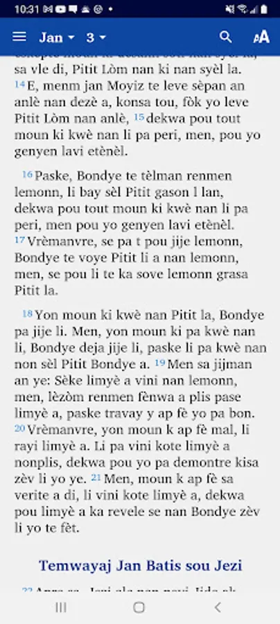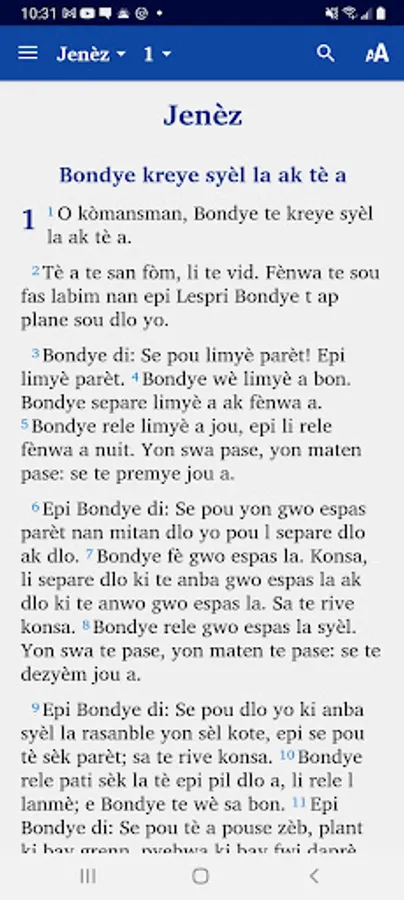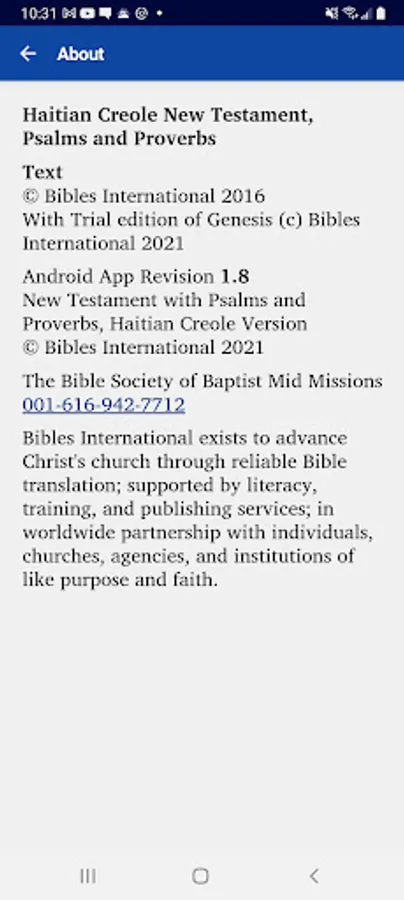 This app provides a translation of the New Testament into the Haitian Creole language. It also includes the Psalms and Proverbs and a trial edition of Genesis. It is produced by Bibles International, the Bible society, translation and publishing department of Baptist Mid Missions.