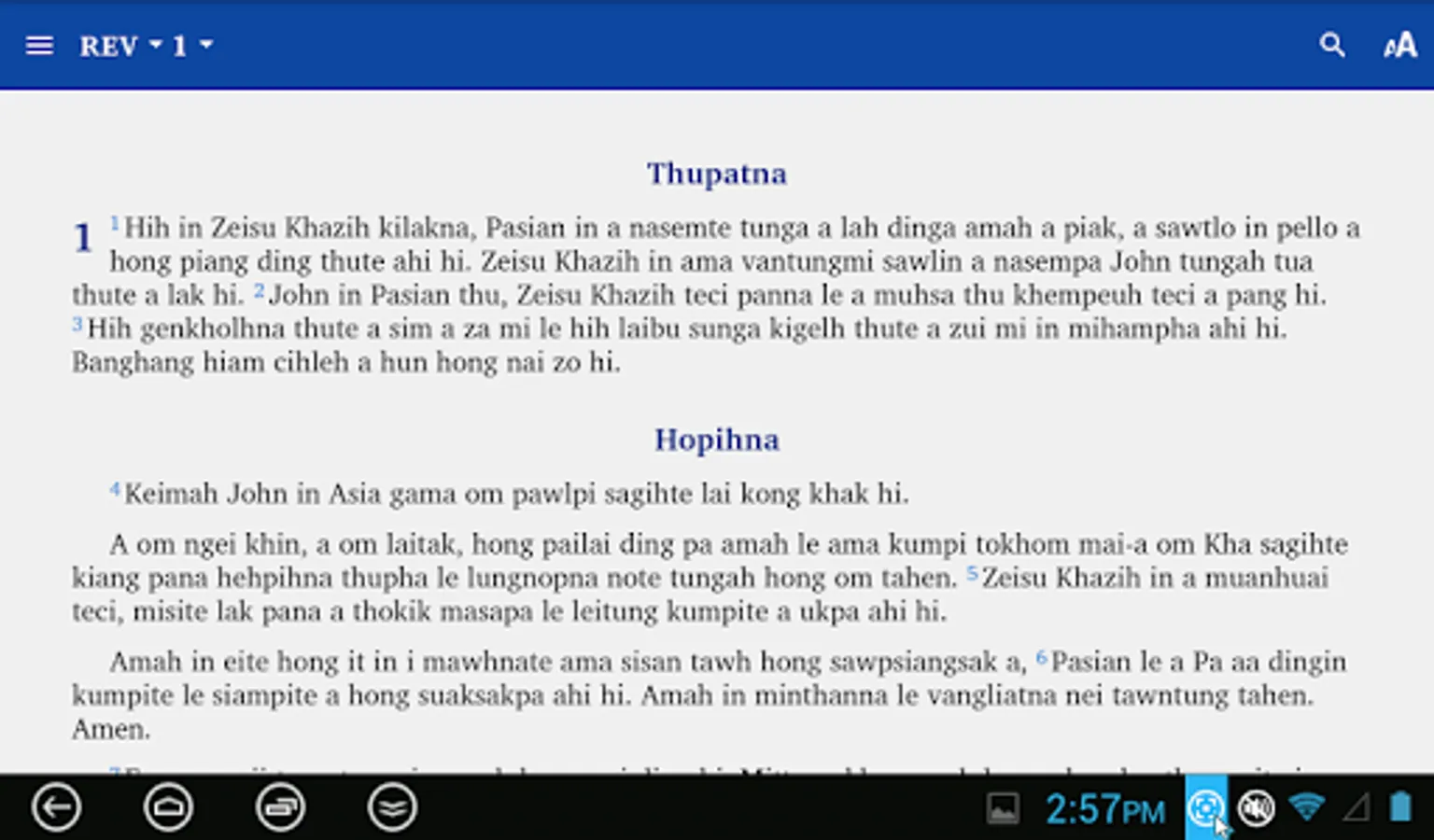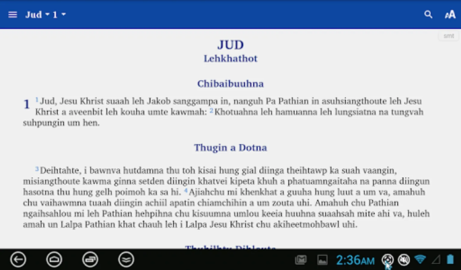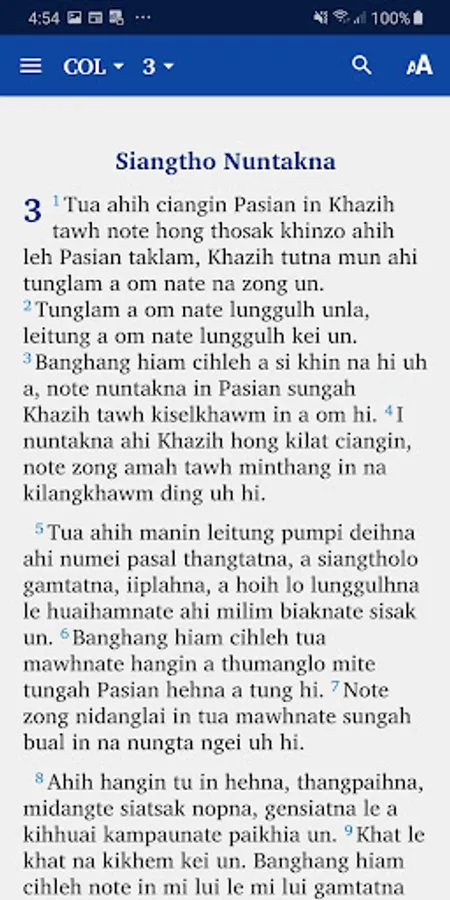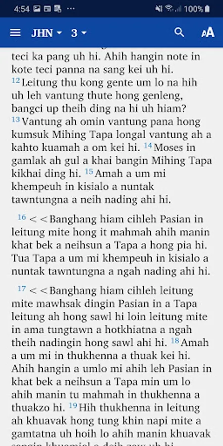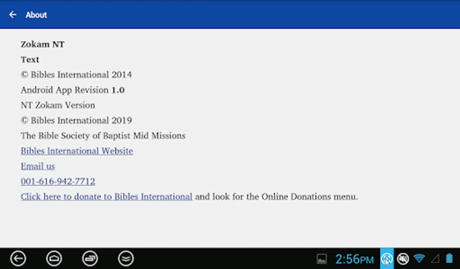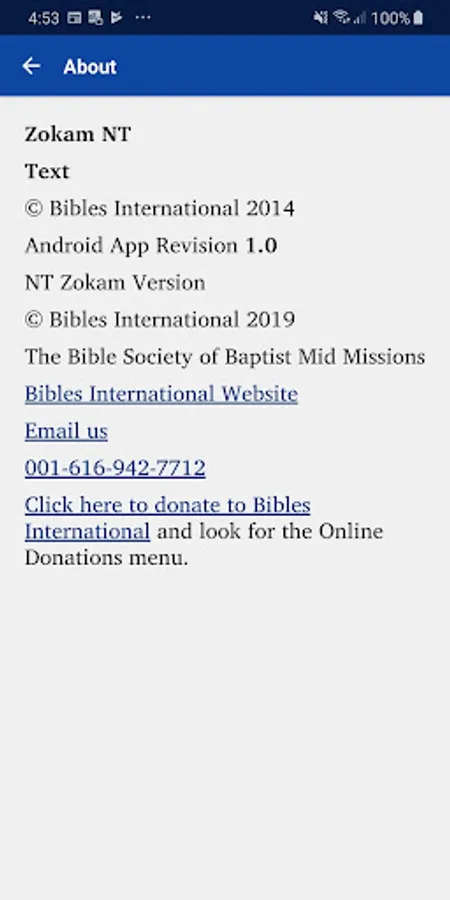 This app provides a translation of the New Testament and many Old Testament books into the Zokam (Tedim Chin) language. It is produced by Bibles International, the Bible society, translation and publishing department of Baptist Mid Missions.