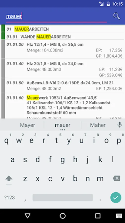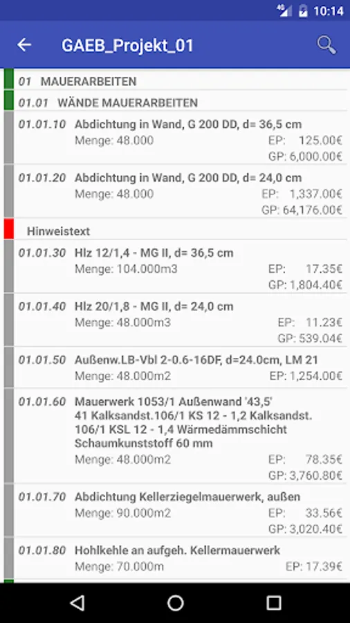 The LV viewer reads bills from GAEB d83 / x83 files and makes the short texts constitute a list. The corresponding long text can be opened by clicking on the short text. For quickly finding certain passages is a search available scans which long- and short text both. Is a fitting d84 / x84 file (same filename) exists, unit and total price are also displayed.