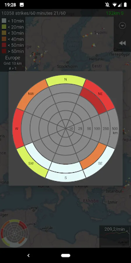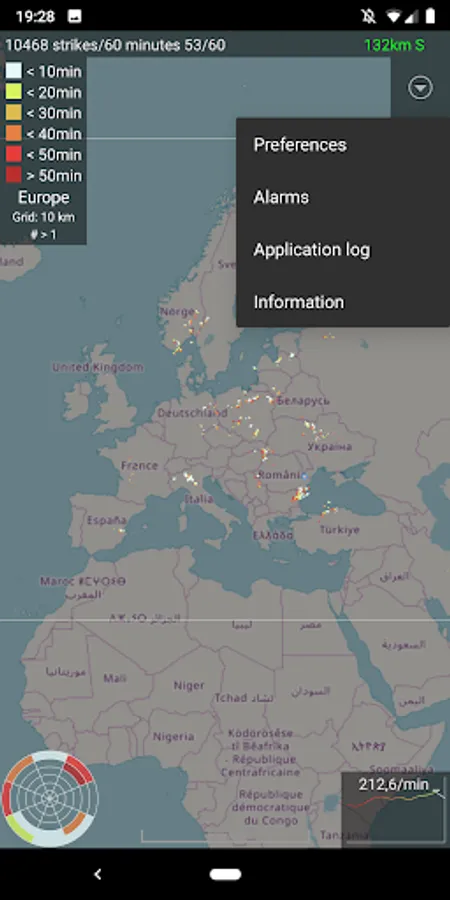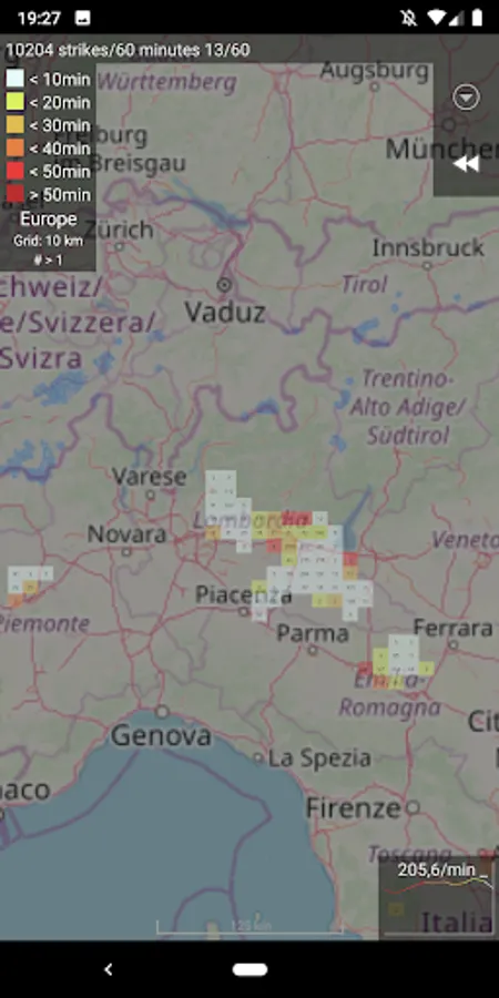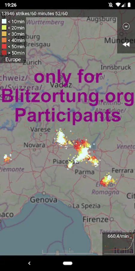The raster display ensures a fast performance of the application even if there is a very high thunderstorm activity. Blitzortung.org participants can visualize all stroke locations individually.