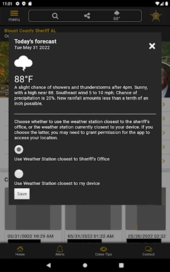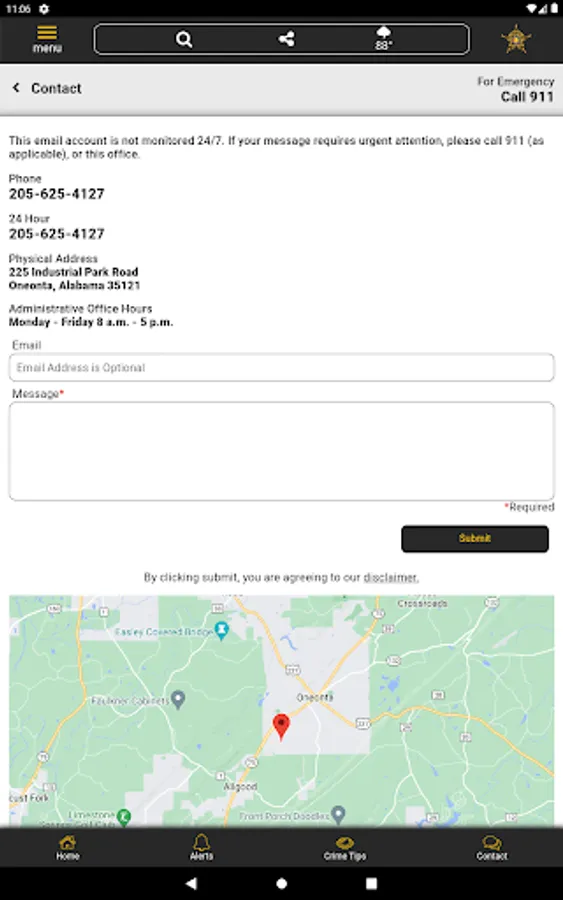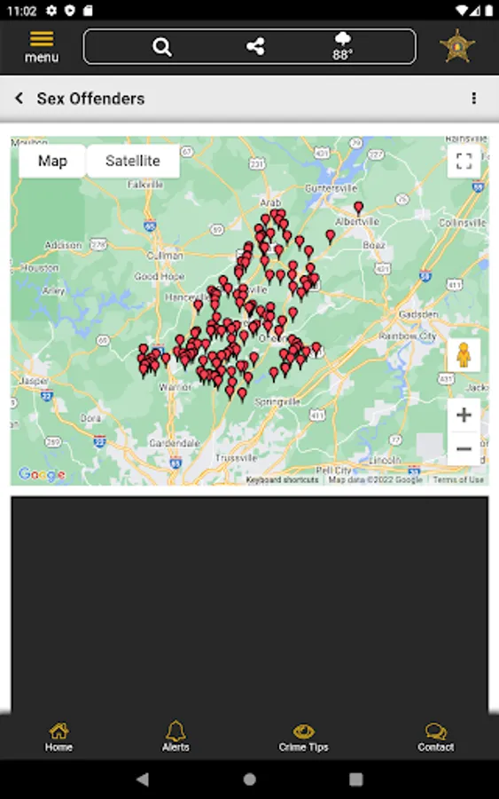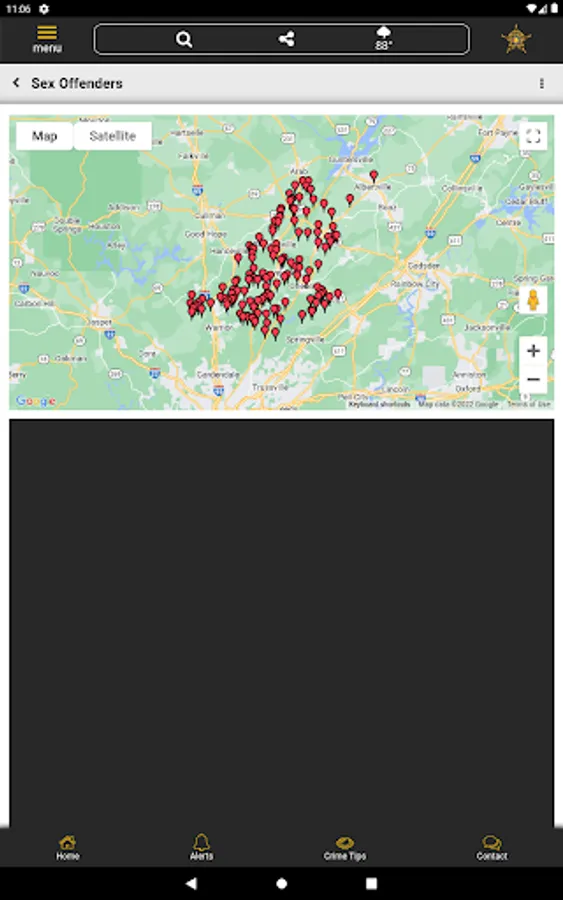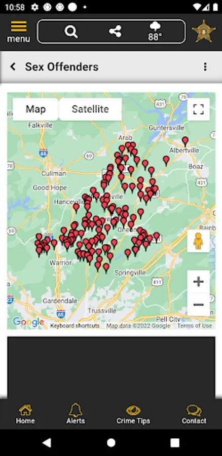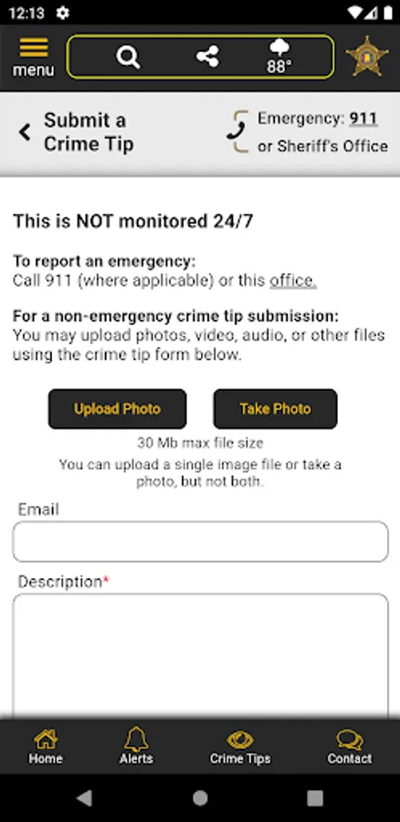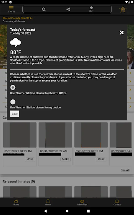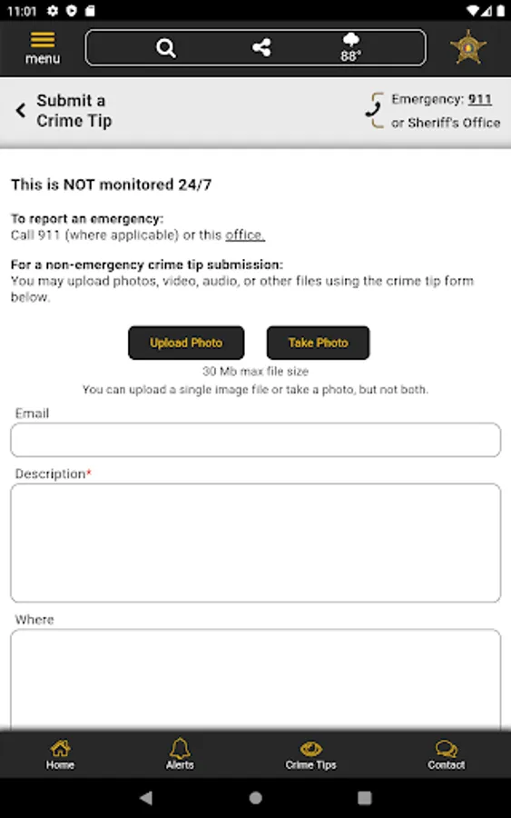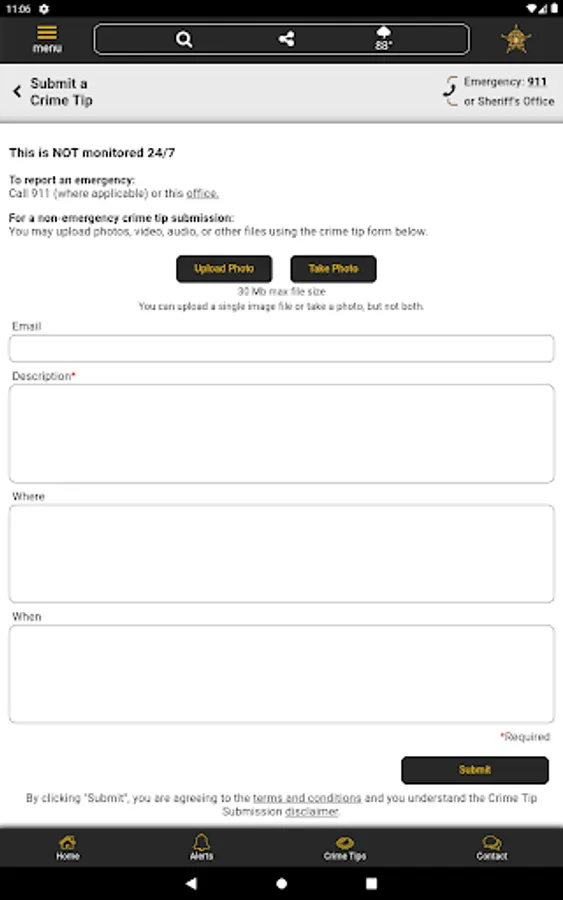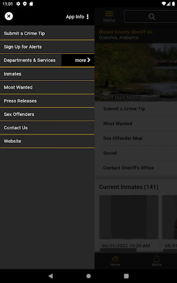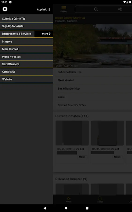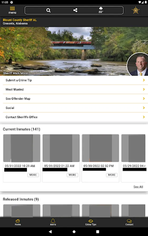 The app has public information for press releases, inmates, most wanted, registered offenders, and special alerts. Crime tips and contact us messages can be sent to the Sheriff's Office