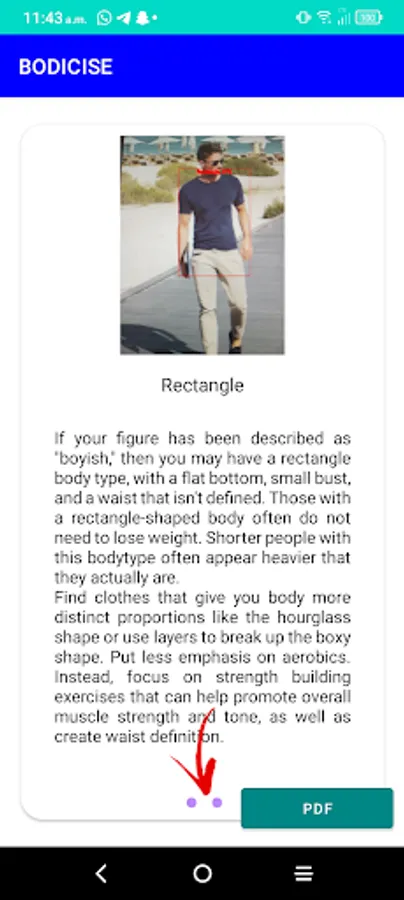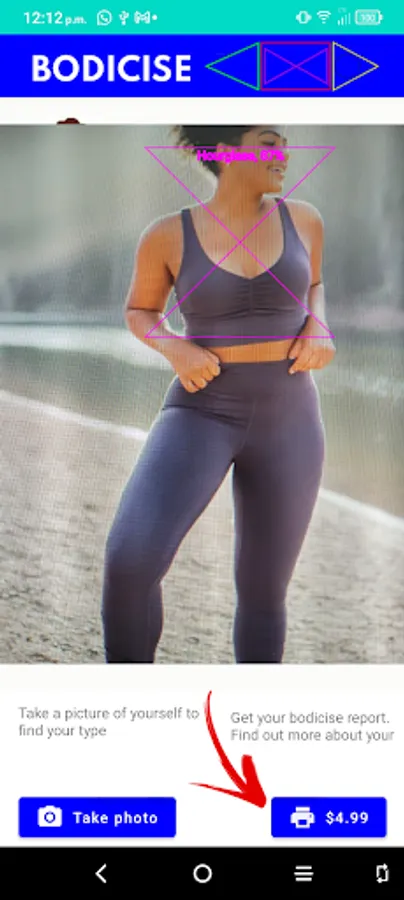 The application uses the image captured in the device camera to identify the bodytype of person in the image. You can then use inapp purchases to purchase an indept bodytype report forcusing of specific exercise that compliment your bodytype.