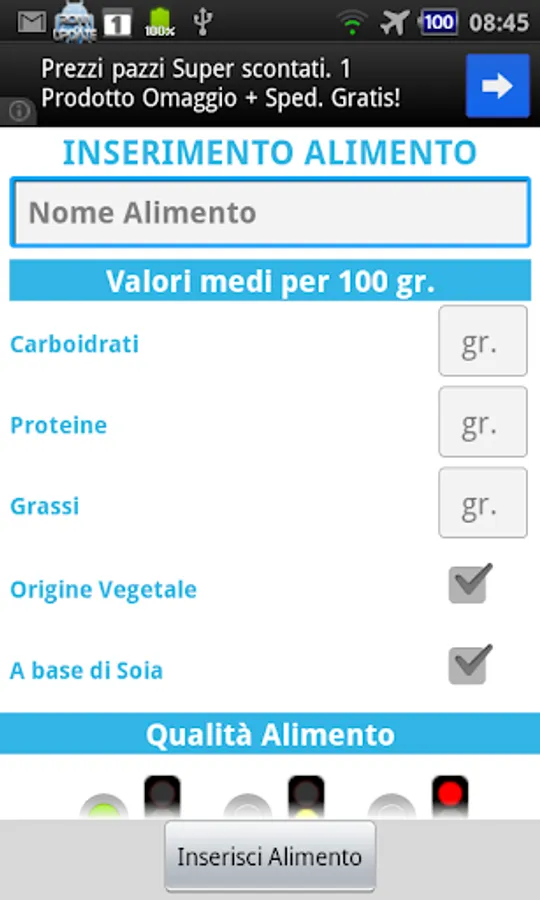 The database contains all the items contained in INRAN official tables, for a total of almost 500 foods, be they carbohydrates, proteins and fats.