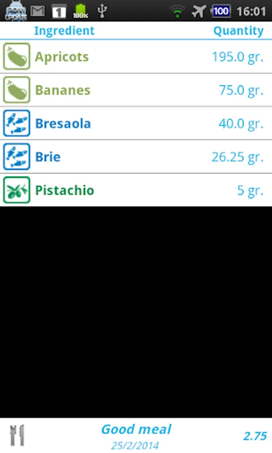 select food, define miniblocks and the app will give you the weight (only grams) of every part of your meal!