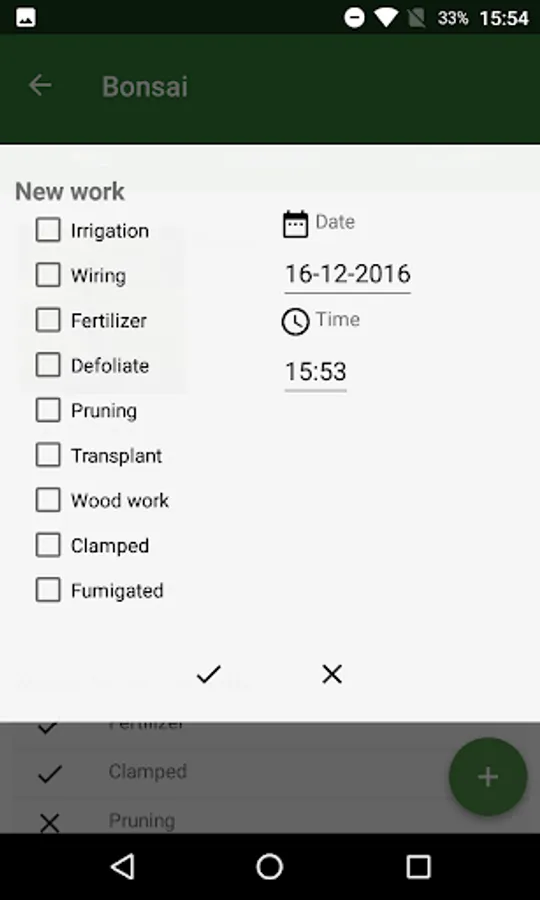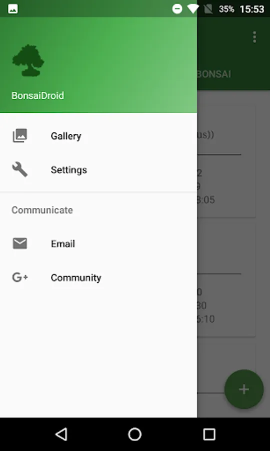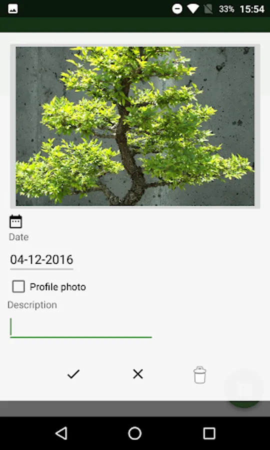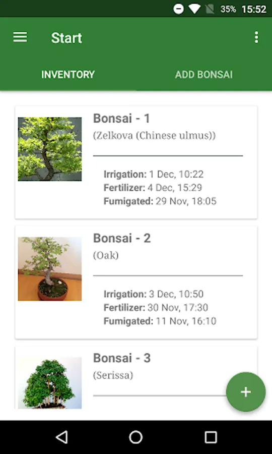 Add photos of your bonsais to see their evolution. And create backups allowing to use your data base in other Android devices.