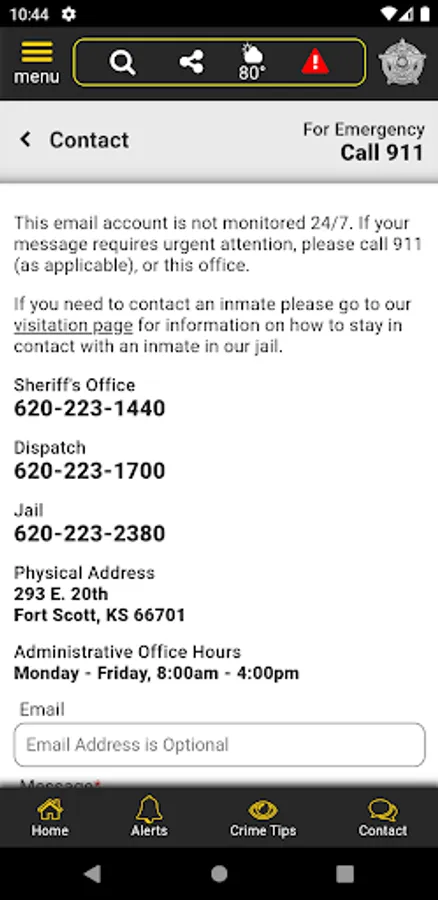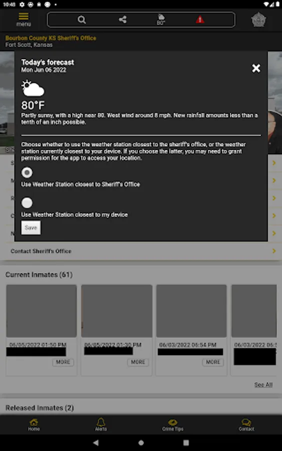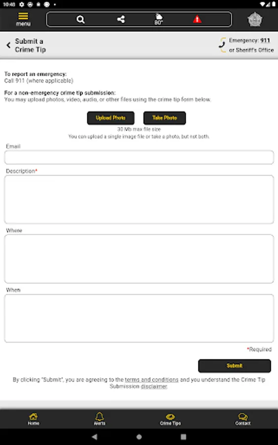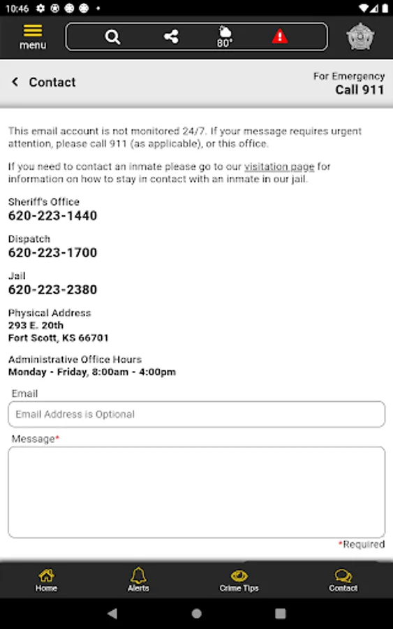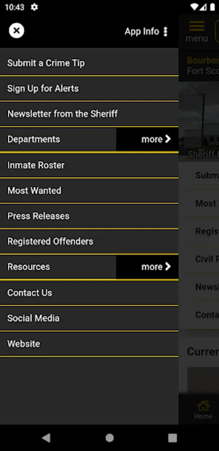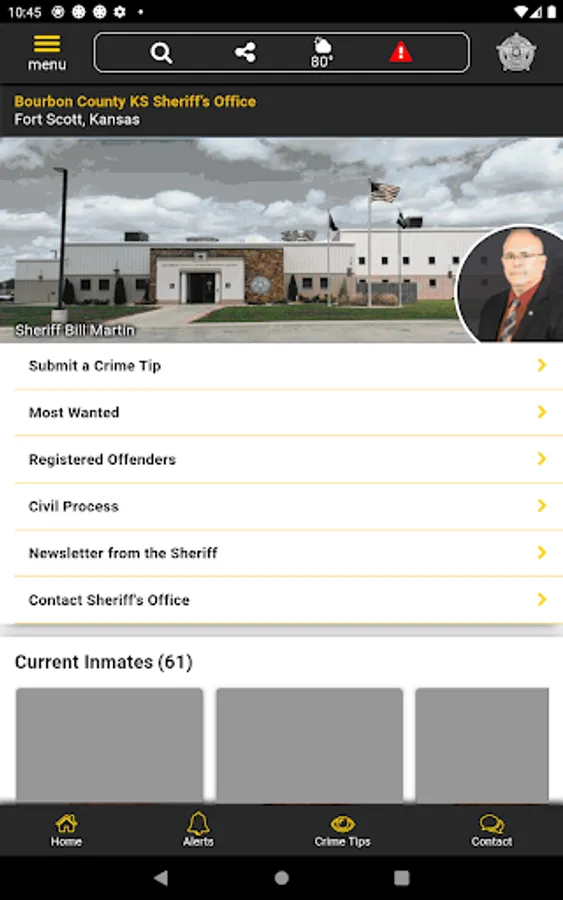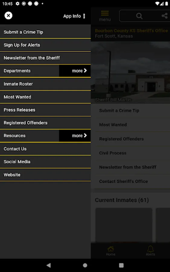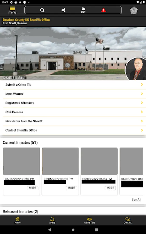 The app has public information for press releases, inmates, most wanted, sex offenders, special alerts, and FAQ's. Crime tips and contact us messages can be sent to the Sheriff's Office.
