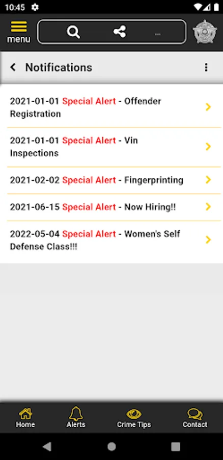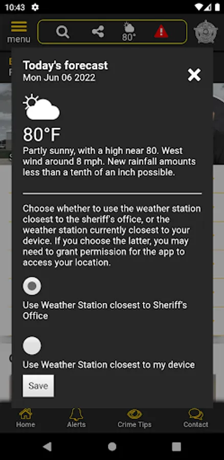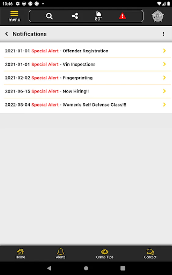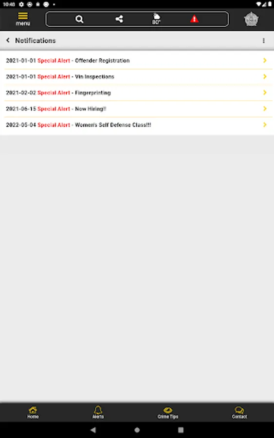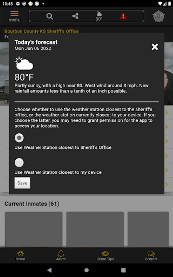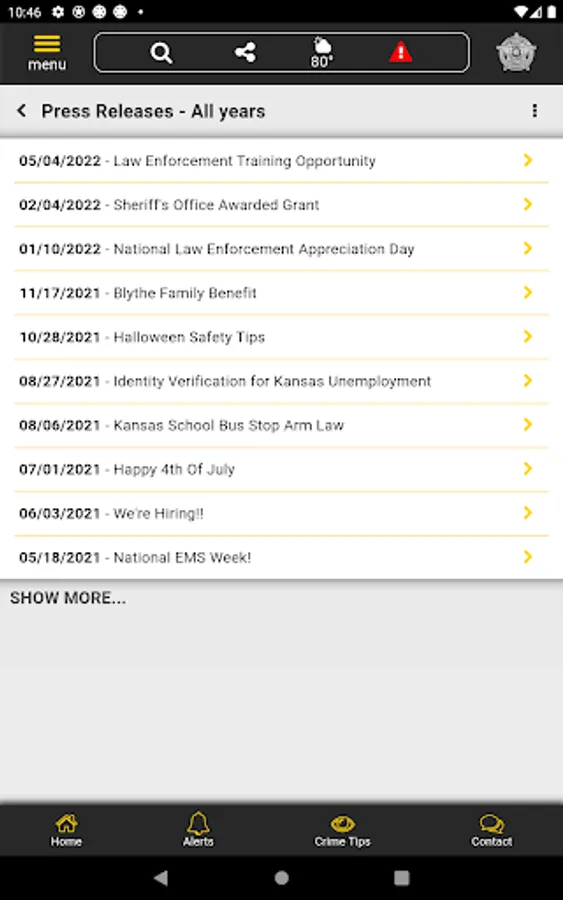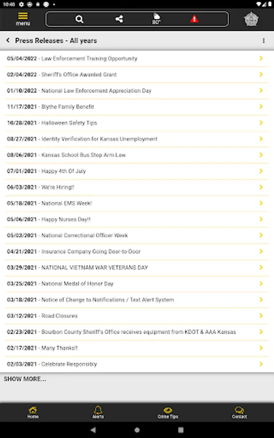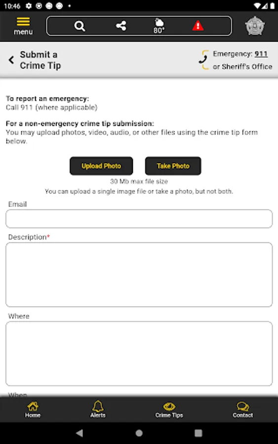 The app has public information for press releases, inmates, most wanted, sex offenders, special alerts, and FAQ's. Crime tips and contact us messages can be sent to the Sheriff's Office.