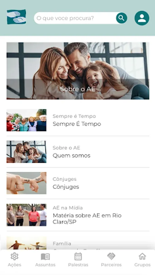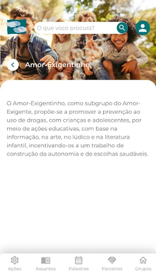 recovery from the use and abuse of alcohol and other drugs; Amor-Exigentinho – proposal aimed at children and young people who use the Amor-Exigente Program (PAE) in a playful, clear and objective way, aiming to help them adopt responsible and healthy attitudes; Always It's Time – focused on older adults who often go through “empty nest syndrome” or face the challenge of taking care of their grandchildren while their parents work and/or study; and Spouses - intended for people in romantic relationships with users of alcohol and other drugs.