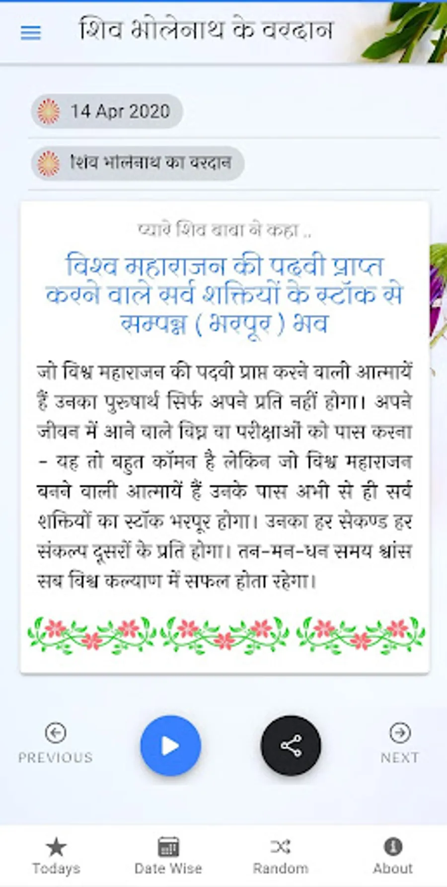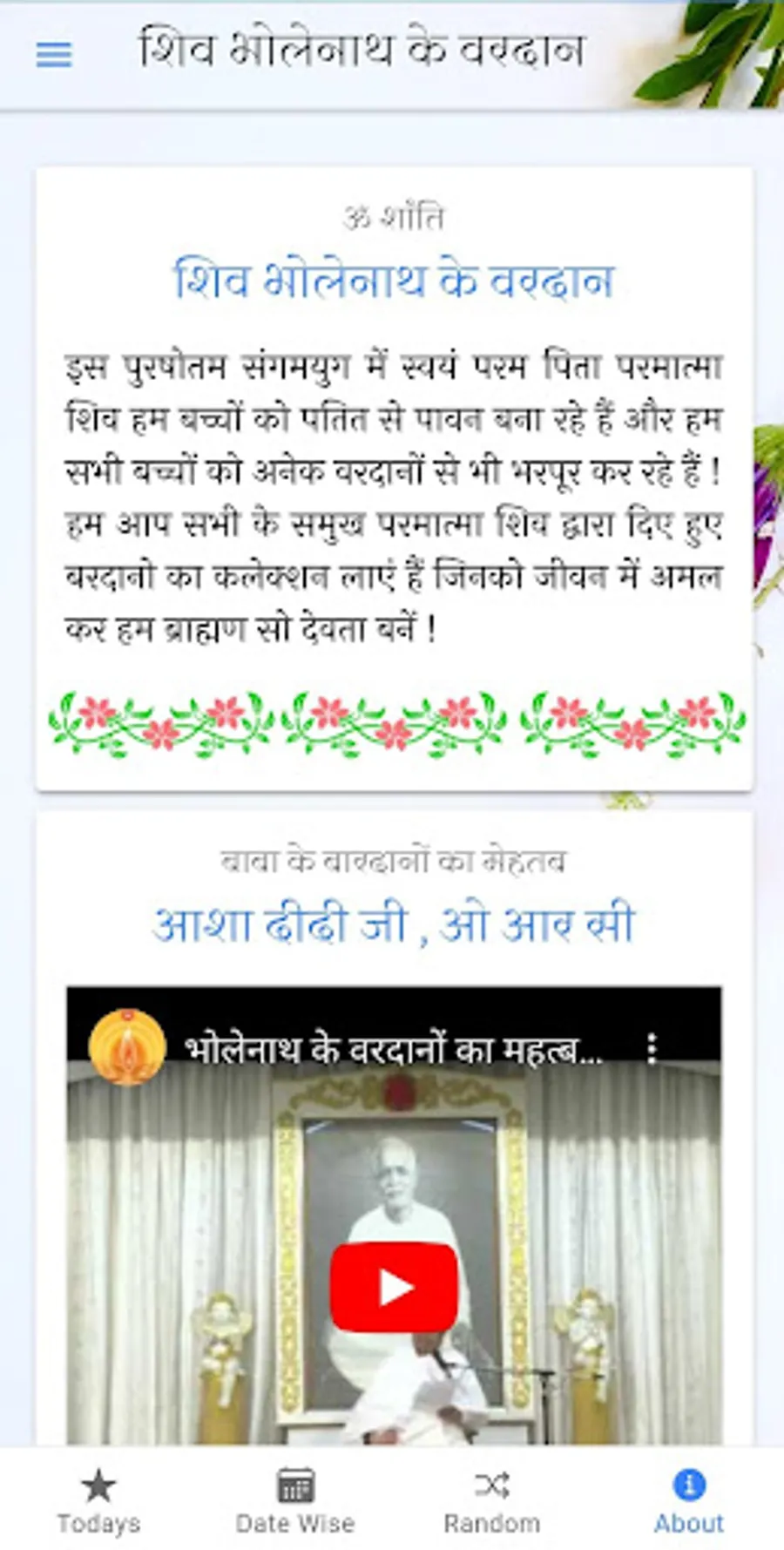 This APP is designed to bring to you the collection of daily and all previous vardans ( Blessings ) given to us by our BaapDada.