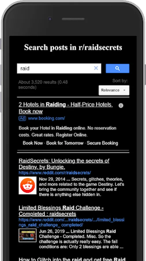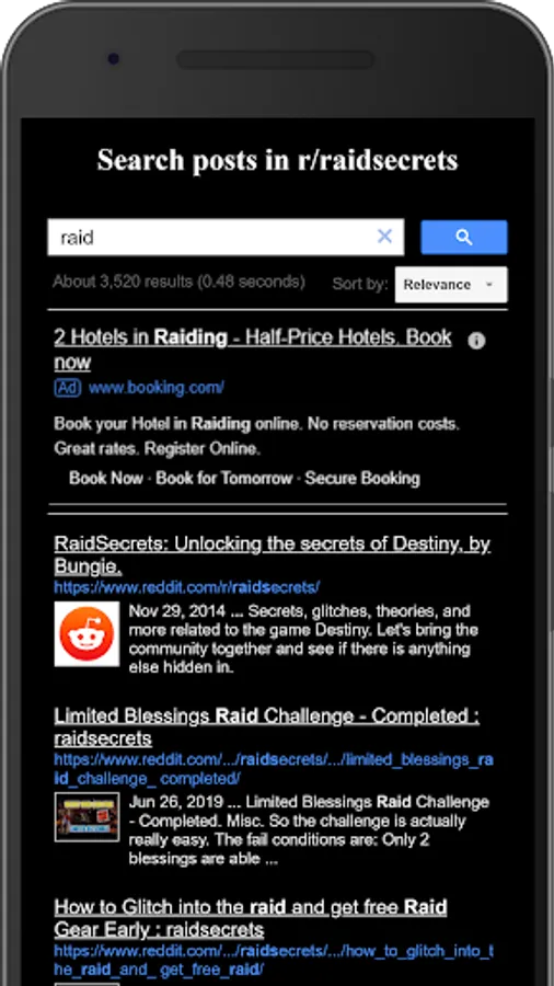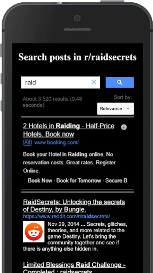 Raidsecrets Search have zero relation with Raidsecrets on Reddit. We are an independent entity that allows you to search posts on /r/raidsecrets reddit with the power of google custom search. We don't collect your data, Google does (for ads and tracking).