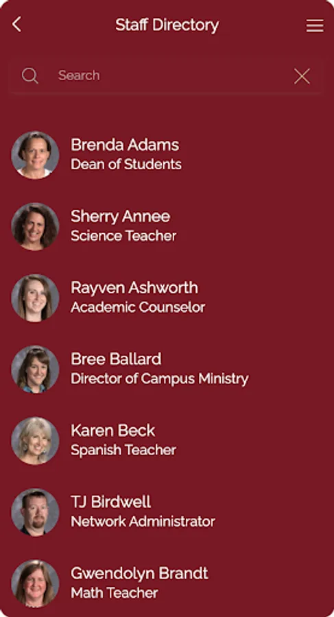 • Faculty/Staff Directory - Faculty and staff along with their contact information is readily available. Just scroll through or search by name.