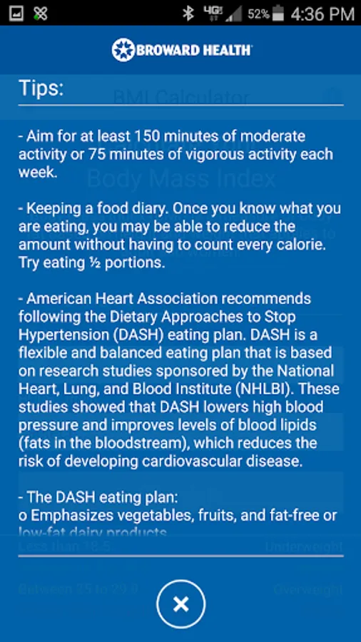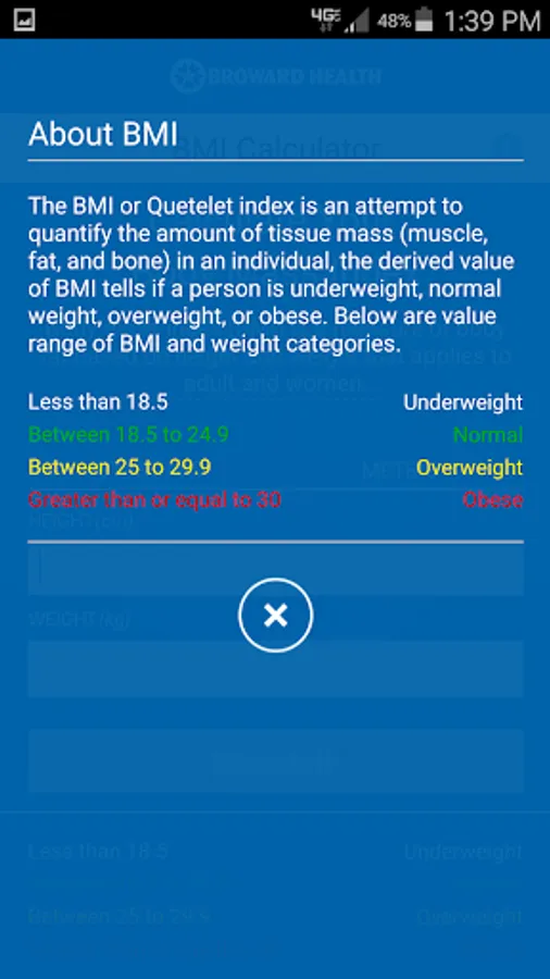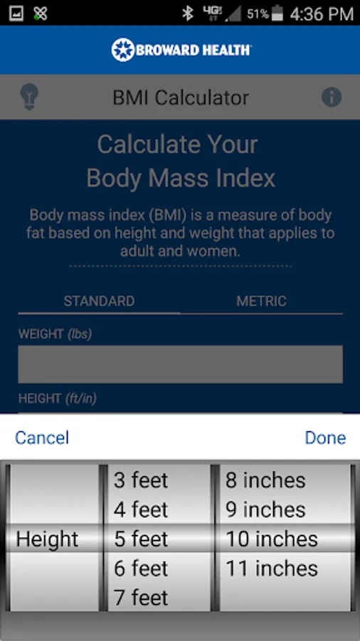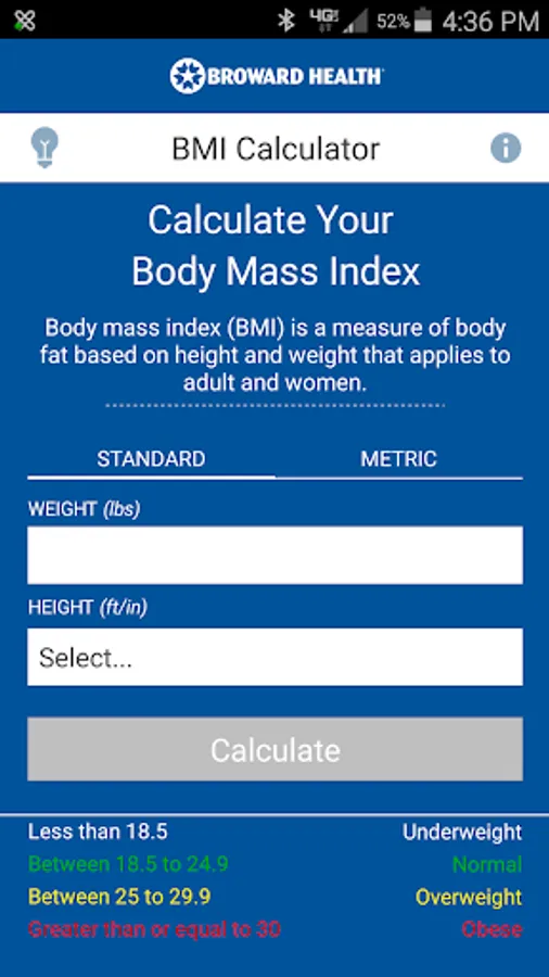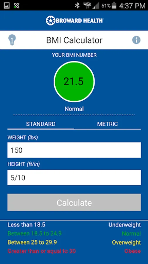 This Broward Health application will calculate your Body Mass Index (BMI) using your height and weight. It's very simply enter your weight and height in metrics or standard US units and the application will give you your BMI in seconds...