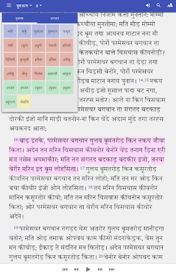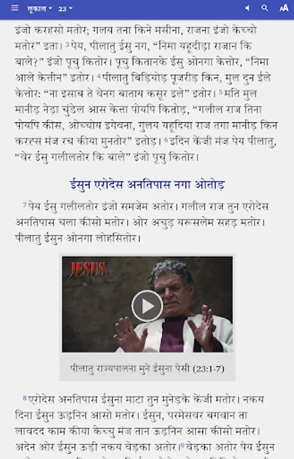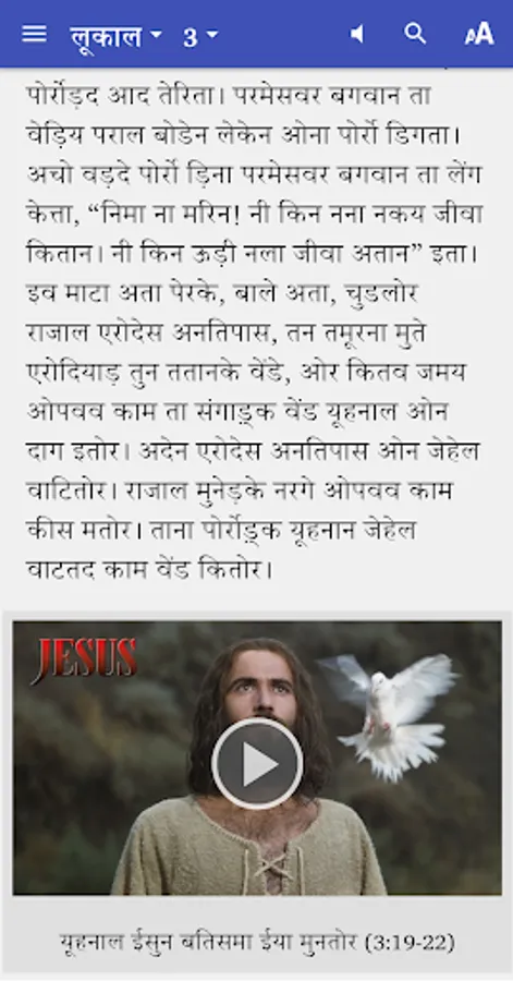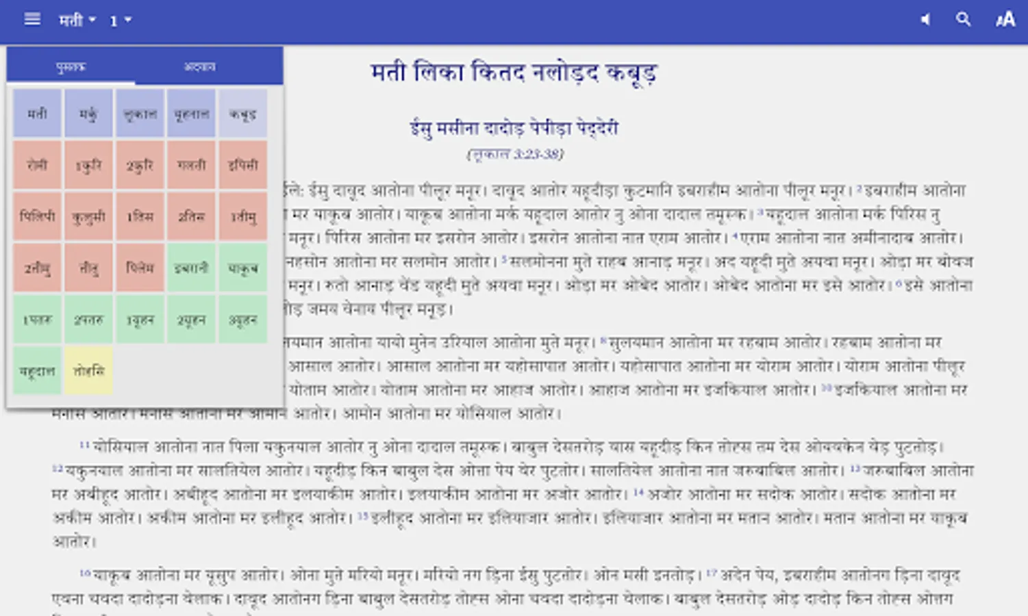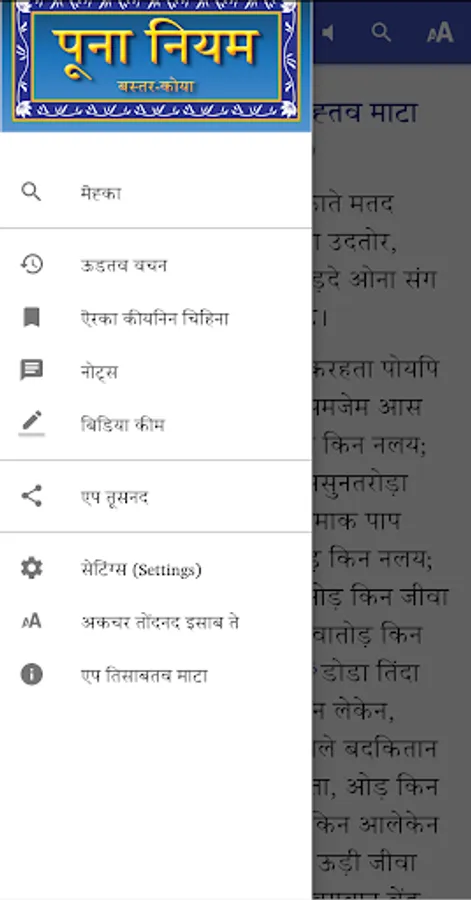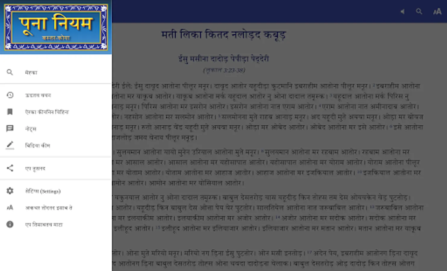 Puna Niyam (in the Bastar Koya language) was first published by BSI in partnership with IEM in 2010 and now this New Testament has been made available as an interactive app. Courtesy of TWR and WCOI, the synchronized audio of the text may also be heard. These audio files can be downloaded and then be available for off-line use. The Gospel of Luke includes short video clips from The JESUS Film interspersed throughout the text (internet access is required for this feature).