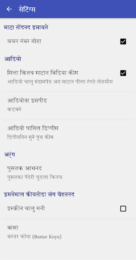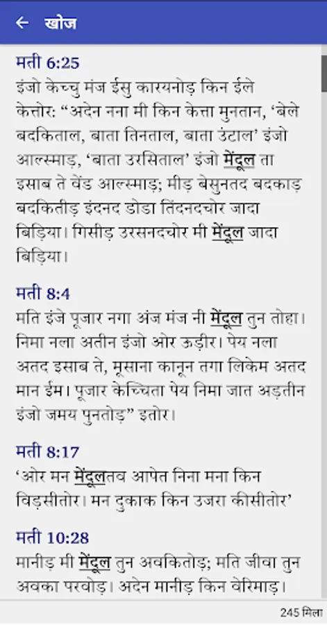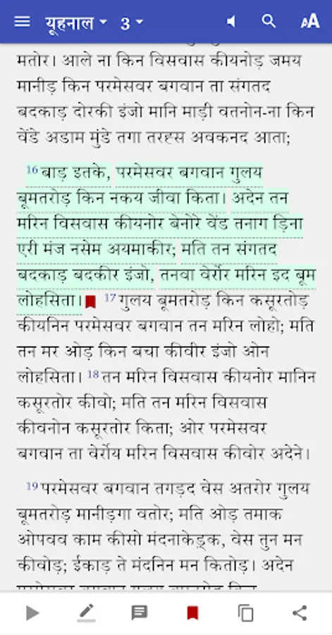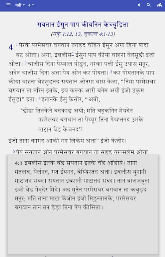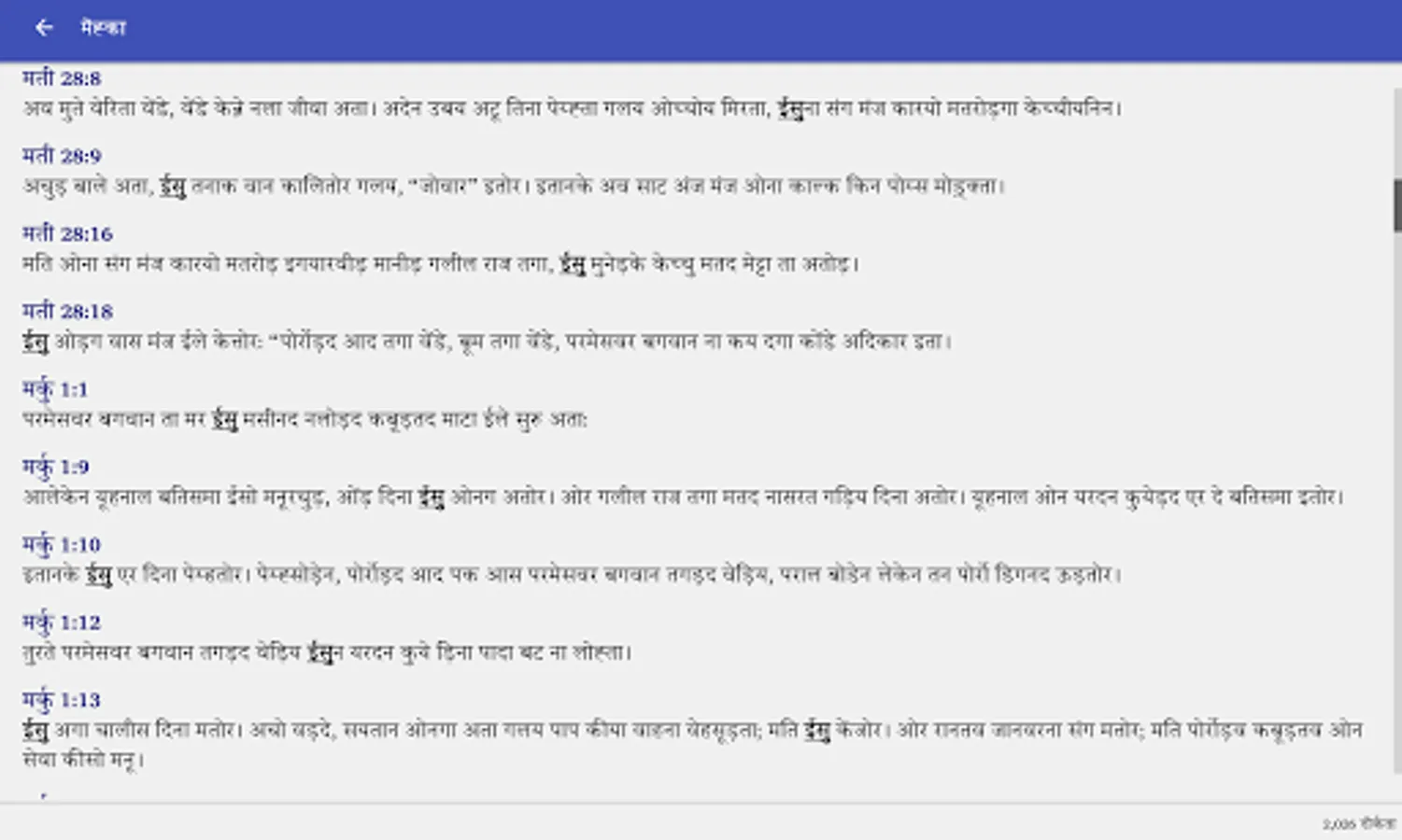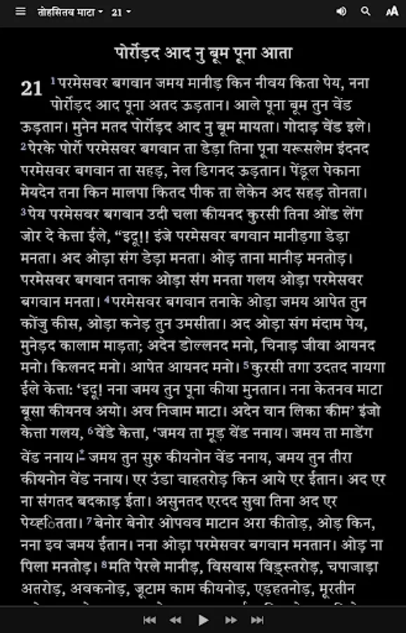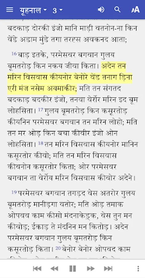 Puna Niyam (in the Bastar Koya language) was first published by BSI in partnership with IEM in 2010 and now this New Testament has been made available as an interactive app. Courtesy of TWR and WCOI, the synchronized audio of the text may also be heard. These audio files can be downloaded and then be available for off-line use. The Gospel of Luke includes short video clips from The JESUS Film interspersed throughout the text (internet access is required for this feature).