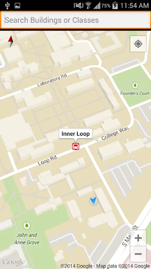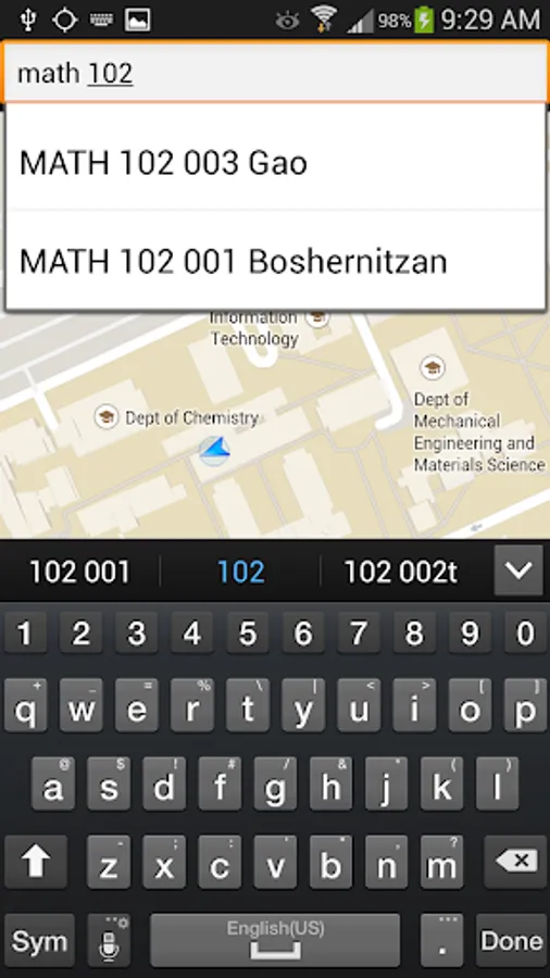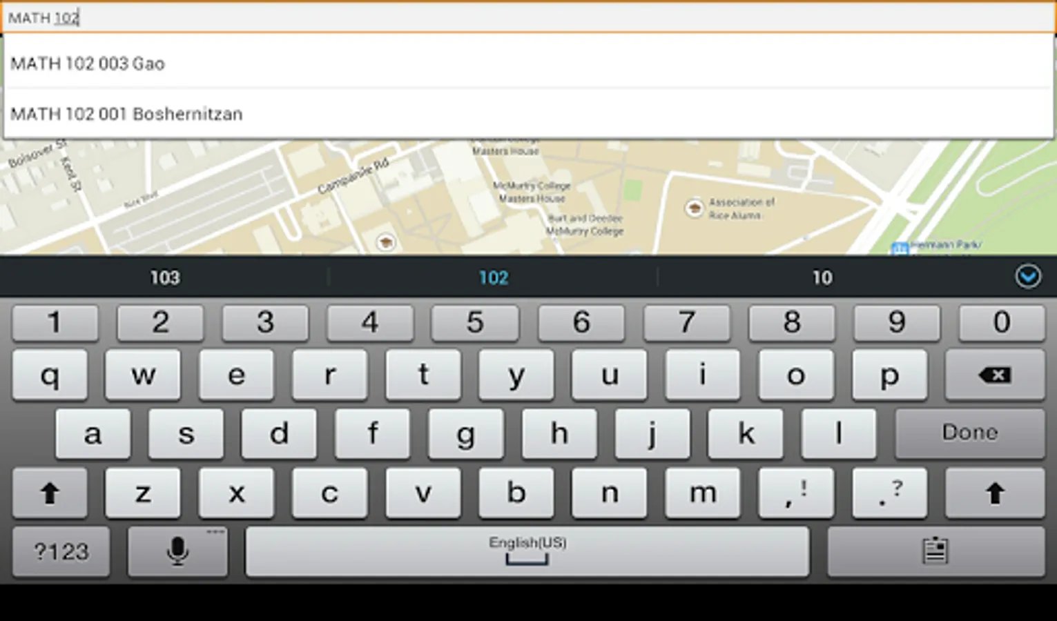 -Users can find locations of classes using course number or professor (e.g. "CHEM 121 Tran" will bring up a building on the map)