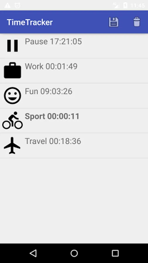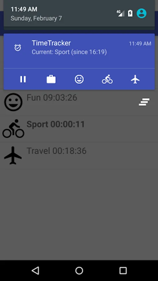 Very minimalistic time-tracking app for 5 broad categories (Pause, Work, Fun, Sport, Travel) that can be directly accessed from the notification drawer or an Android Wear device.