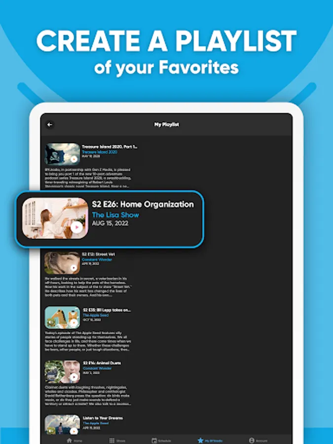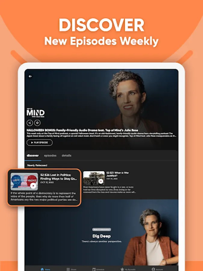 - Stream engaging podcasts like The Apple Seed, The Lisa Show, In Good Faith, and more.