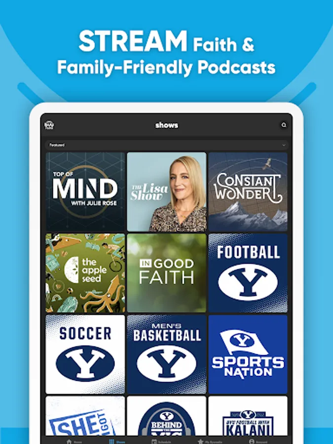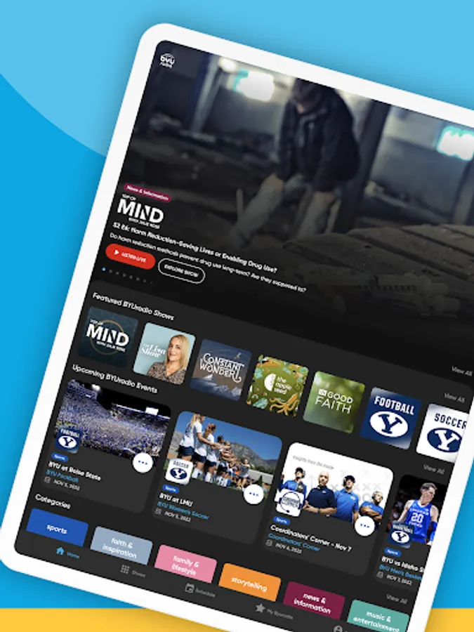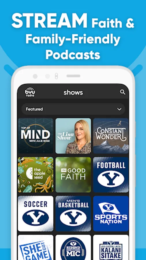 Our family streaming app has something for everyone. Tune into talk radio or stream engaging podcasts like The Apple Seed, The Lisa Show, Constant Wonder, Top of Mind, In Good Faith, and BYU Sports Nation. Listen to sports talk and podcasts with live coverage of your favorite BYU teams with BYU Sports radio. BYU football, basketball, baseball, volleyball and soccer - all streaming live on the BYUradio app.