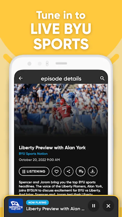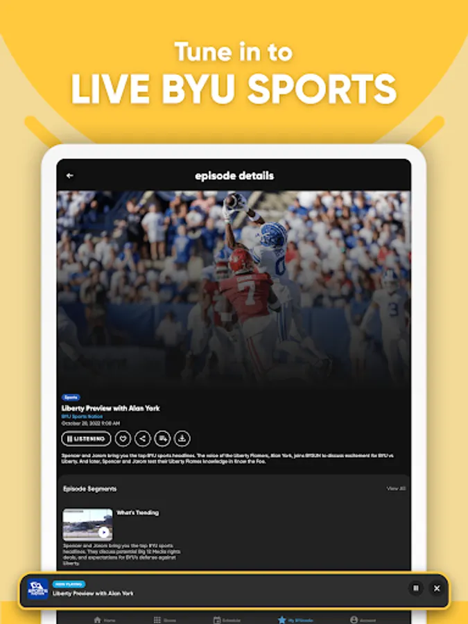Your audio on demand streaming app and podcast platform featuring uplifting lifestyle podcasts, current events, storytelling, Christian audio, and the best of BYU sports. Listen to music, discover new, engaging podcasts, or catch up on the latest BYU sports updates all from one place.