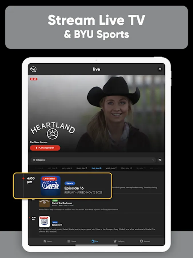 Watch TV anywhere at any time with BYUtv. We bring inspiring and wholesome content for the whole family, from kids movies and live TV, to free sports game replays for everyone. Enjoy on demand TV shows and movies, meant to inspire and uplift you every day. Families and friends can come together to watch all the heartwarming content they love on BYUtv.