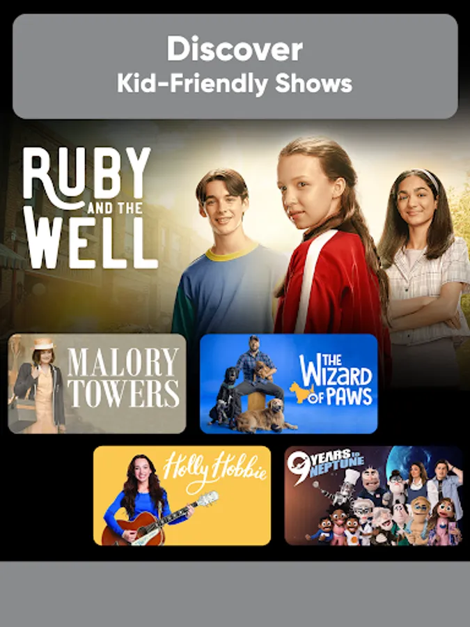 - Watch family-friendly shows like All-Round Champion, Ruby and the Well and The Wizard of Paws