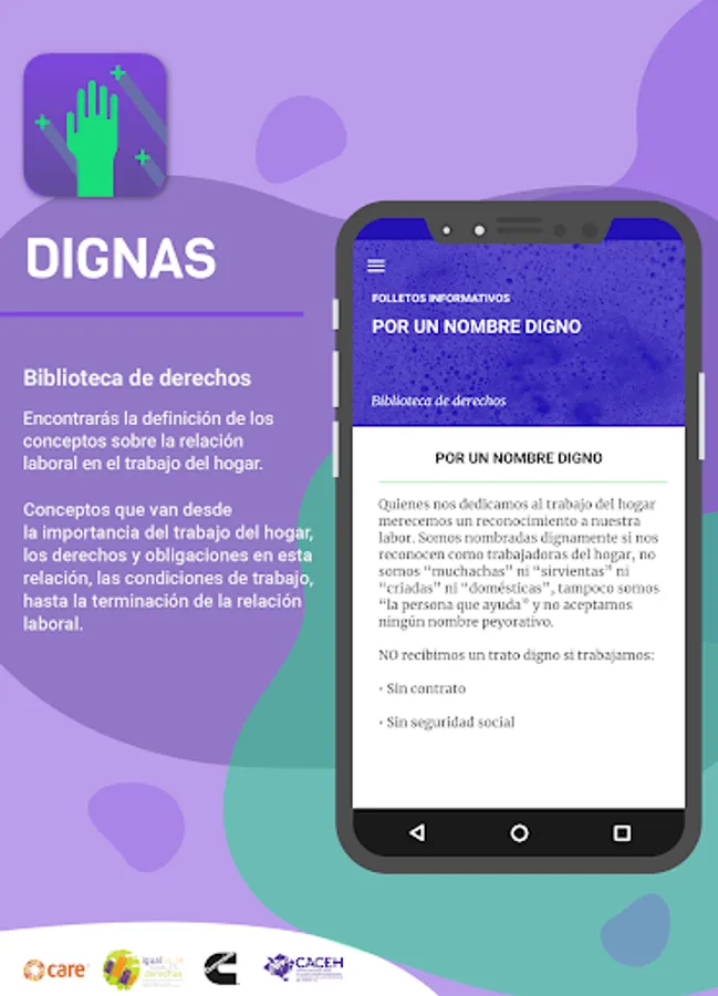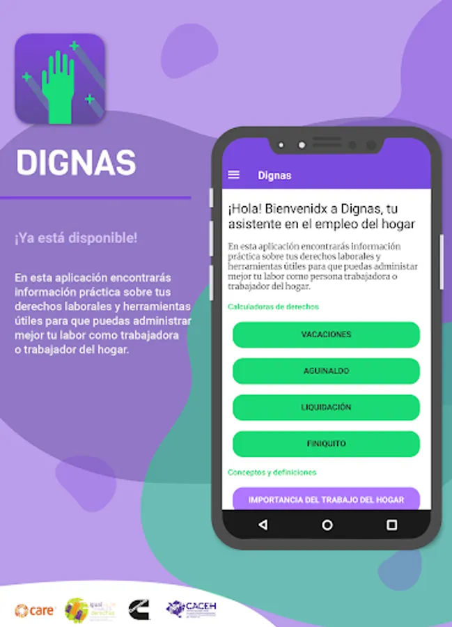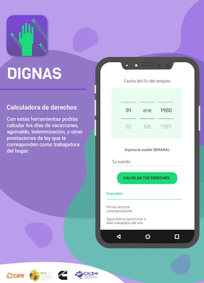 Dignas is an application that puts labor rights in the hands of domestic workers and employers in Mexico to fulfill them fairly. It includes 4 calculators where you can obtain the calculation of the Christmas bonus, vacations, vacation bonus, severance pay or compensation in case of unjustified dismissal.
