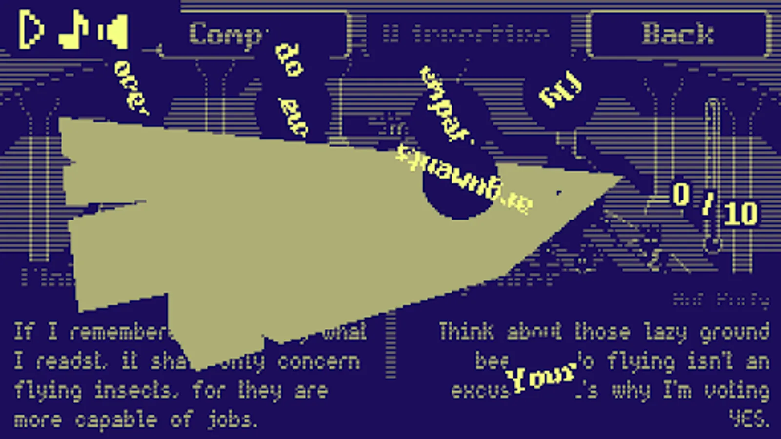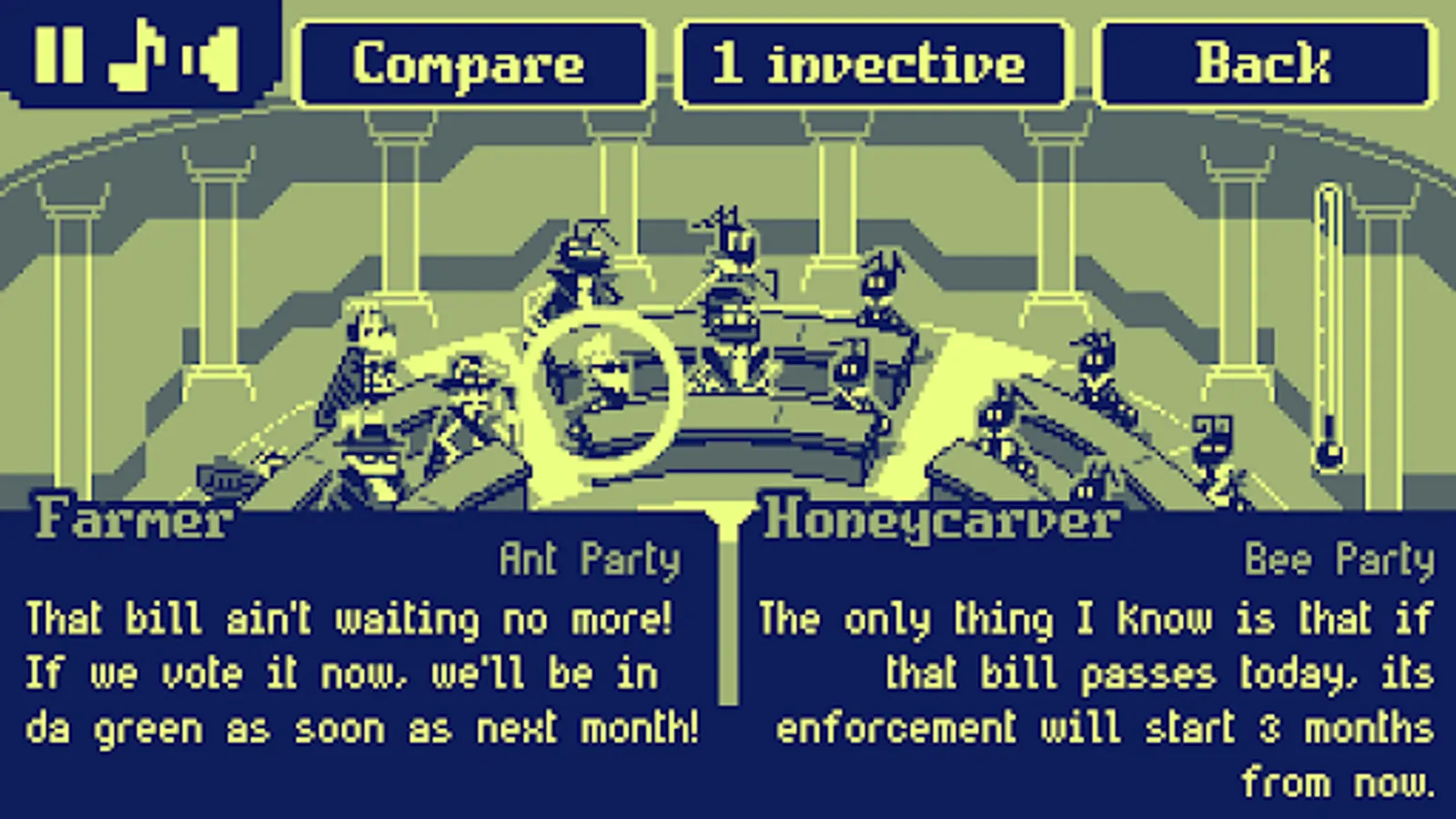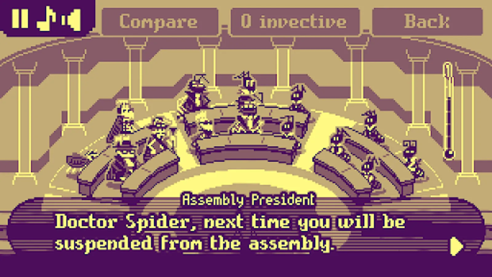 In Uproar, play as Dr. Spider, the substitute of Lord Hermit, as he enters the National Assembly of Insects. From nonchalant grasshoppers to neoliberal ants, your deliberations will not be easy.