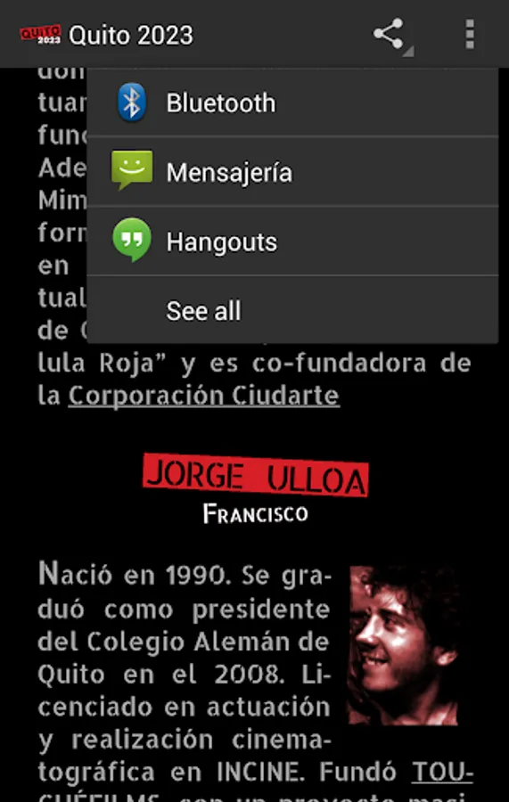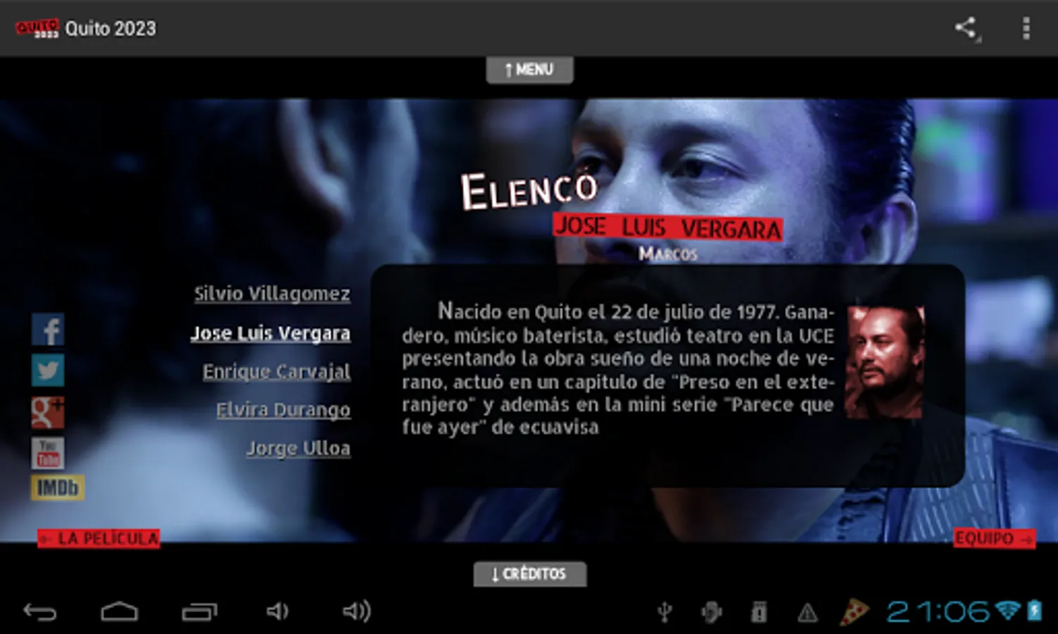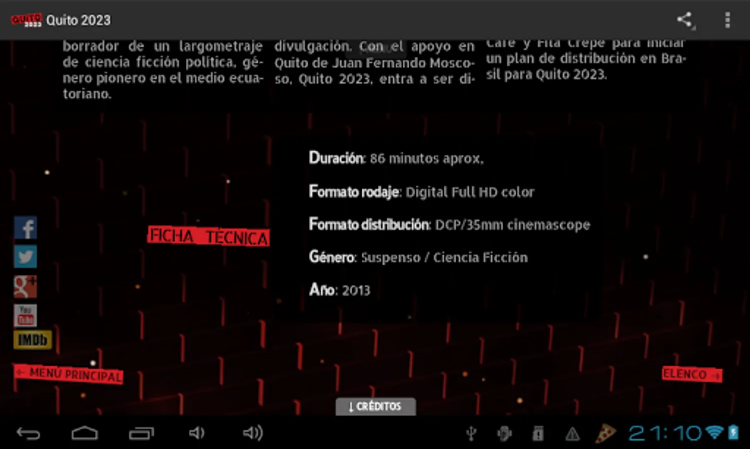 Quito 2023 is a feature length thriller / science fiction that focuses on the Ecuadorian capital, several years from now. After several internal political problems, a coup has left the country in the hands of the military. Quito is the last frontier, the city has been completely fenced, gated and guarded. The film begins from this point focuses on only two locations. One, the palace where the General Ponce, cynical and cunning man who runs the party and is in charge of the city, and the second the headquarters of a group of young revolutionaries led by Marcos and Santiago two guys with visions completely different, each hungry for power and strength, the other a computer guy who has lost all hope for a better tomorrow. The film, having no political agenda, is the hours before the revolutionaries to make one last attack with the objective of overthrowing the tyranny that surrounds the city. These two places and characters are woven together to tell a story that is based directly on dialogues rather than in stocks, which can analyze the attitude of each, between ambition, power, humility and faith of those who expect a better future. The result is an analysis that this maybe is just another case of social upheaval in Latin America, where there really is not a solution in a region characterized by high ungovernable and ingenuity of his own people.