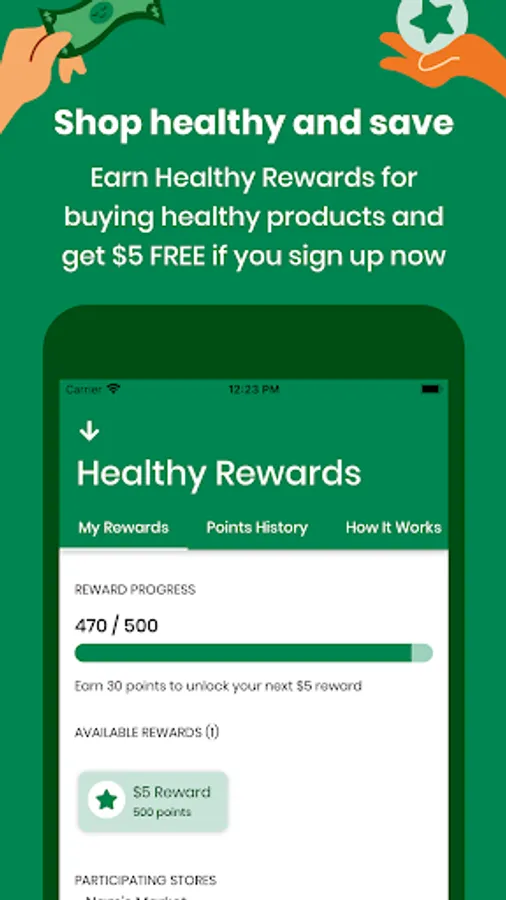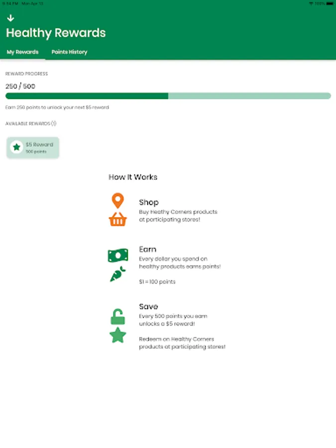 All you need is a phone number to start earning points and rewards at participating Healthy Corners Rewards stores. Use the app to track your progress toward unlocking rewards to redeem for free produce.