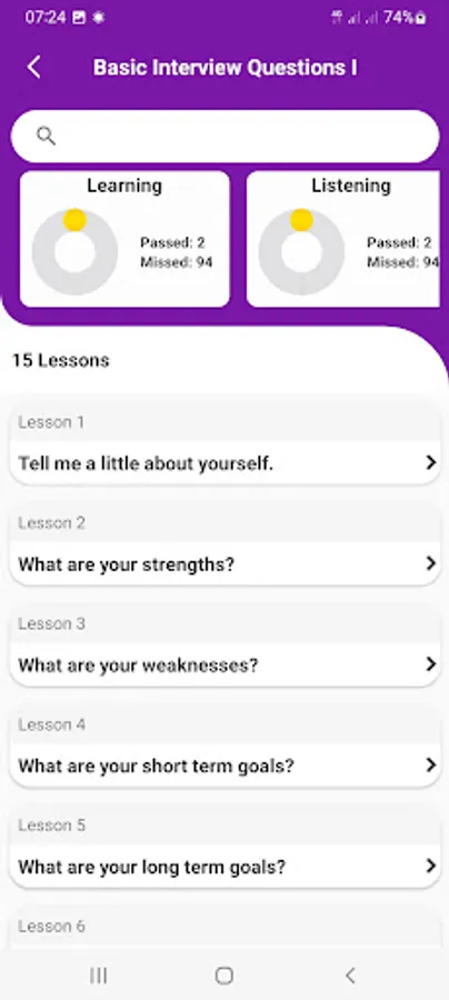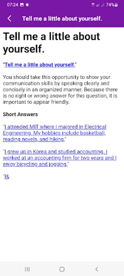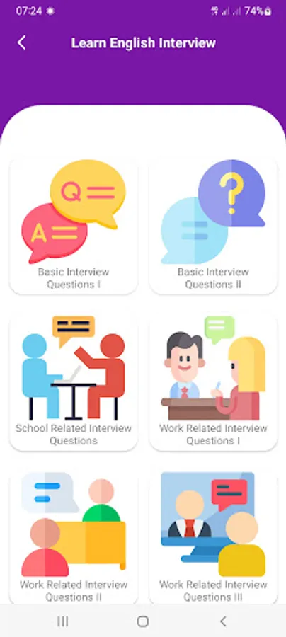 Learn English Interview have over a hundred questions and several hundred answers to study. Each Interview question is listed below each subcategory. Within each lesson, you will find the question and several different ways of answering, along with an explanation.
