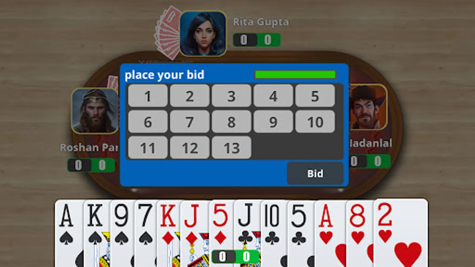 Game is played with 4 players. After all player joins dealer deals 13 cards to each player. Each player then take turn to call how many hand / tricks can they win.