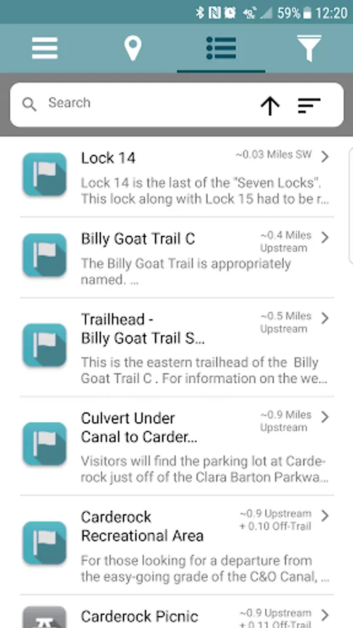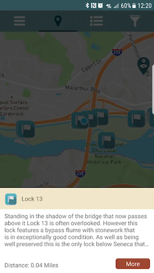 The C&O Canal Explorer app includes over 600 points of interest mapped for you in a searchable format, allowing you to find hiking trails, campgrounds, history, trailheads, parking, and more at a glance. The app also calculates the distance from your location to nearby amenities and points of interest.
