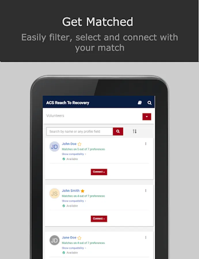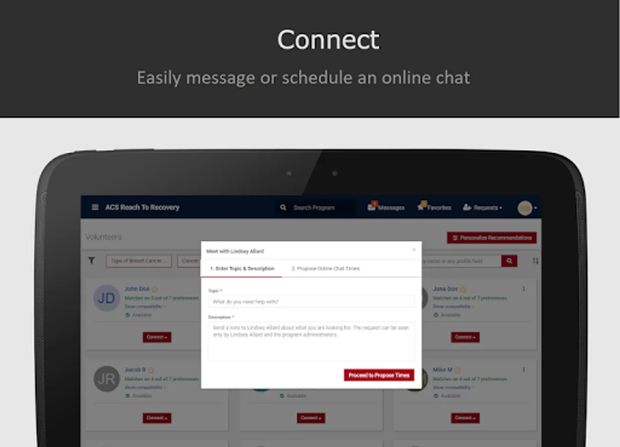 A peer’s preferences are compared to the volunteer profiles. For example, if a peer would like to chat with a volunteer who had a mastectomy, they can select that in their preferences. Peers can review the profiles of the volunteers who best match their preferences.