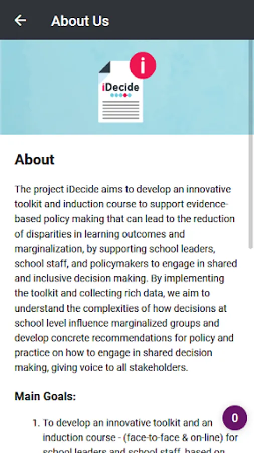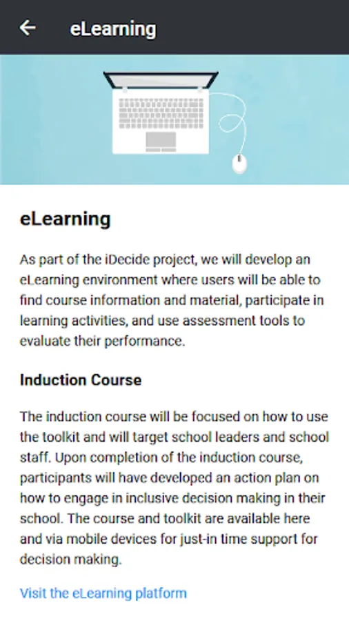 This application was developed as part of the iDecide project. It can be used by school leaders, school staff, and policymakers in order to access an interactive toolkit and induction course. By using these resources, stakeholders can be engaged in shared and inclusive decision making, which can lead to the reduction of disparities in learning outcomes and marginalisation.