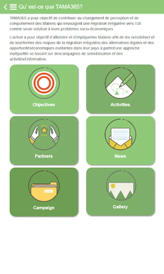 Launched in 2019, TAMA365 aims to provide solid information to Malians on the real risks of irregular migration, on all available opportunities in Mali and in Europe and to deliver useful contact details that can assist them in Mali and in partner countries.