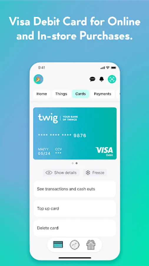 Twig is a Visa Debit card secured. You'll be able to instantly make online or in-store purchases with your free Visa Debit card. Your Twig card is the only free Visa Debit card powered by your old things, so you can enjoy purchases at your favorite stores, websites, apps, restaurants, and more.