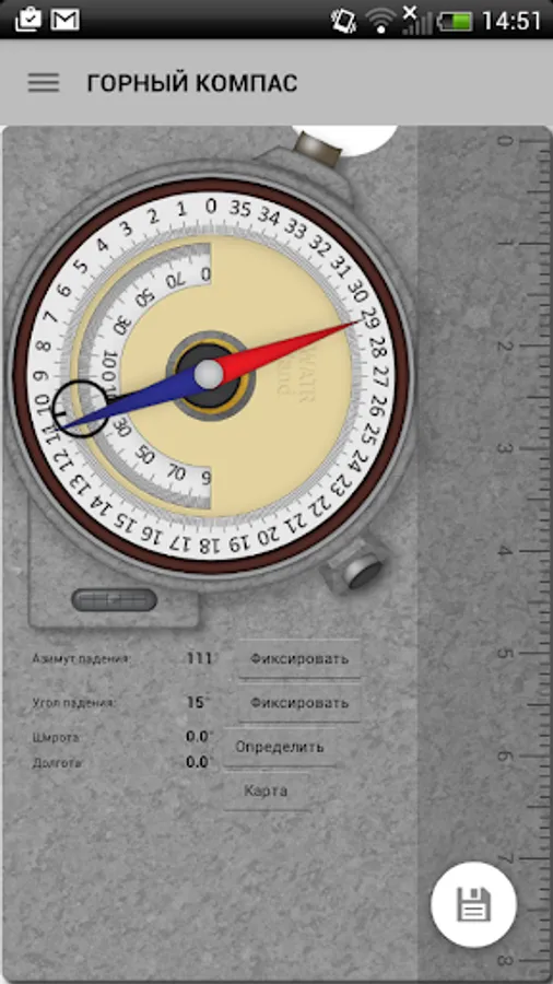 The application allows you to determine the occurrence of the elements of the formation of rocks: the line stretch and fall, measures the magnitude of the angle of incidence; It stores the data with exact geographic coordinates and builds geological route to these points with the ability to add photos and text notes.