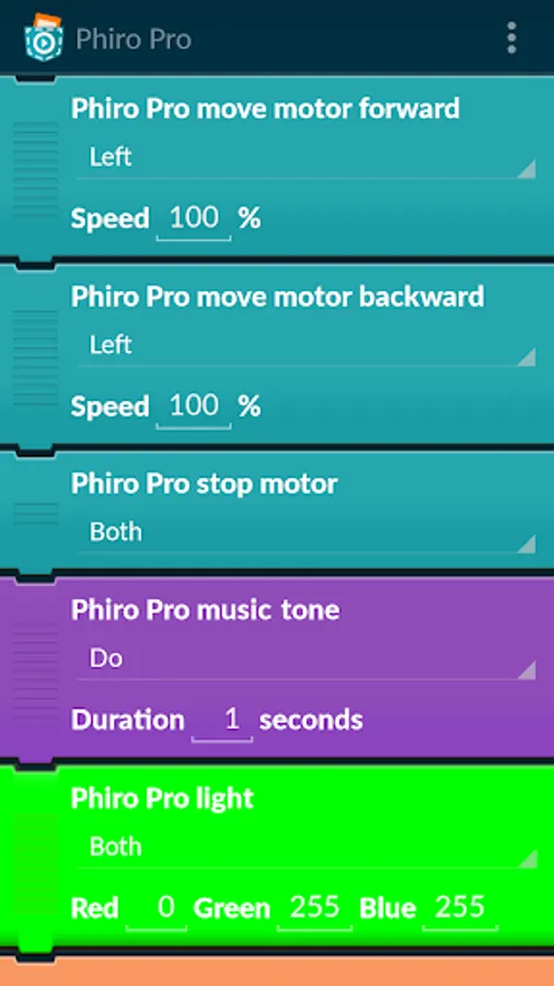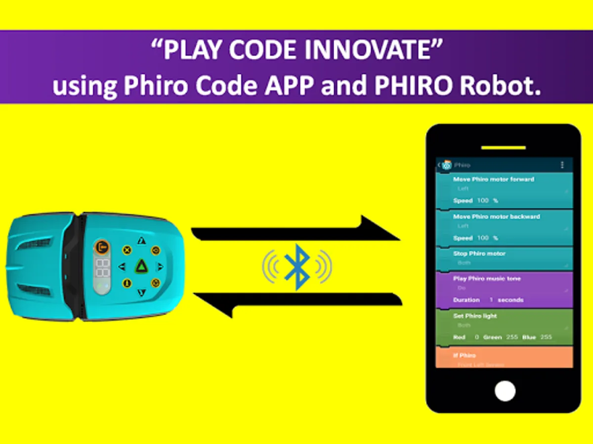 Phiro Code allows you to program and control your Phiro robot wirelessly via Bluetooth using a smartphone or tablet.
