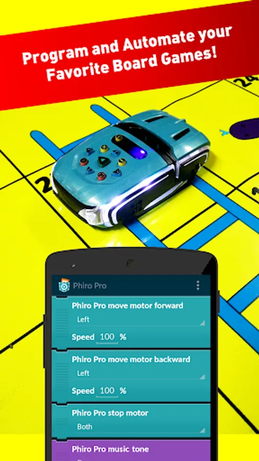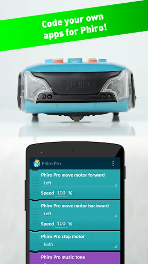 Phiro Code enables you to create, play, share and remix programs in a visual, drag and drop programming environment. You can develop your own app to control a Phiro robot! Games, animations and other Apps now become easy to make directly on your smartphone or tablet.