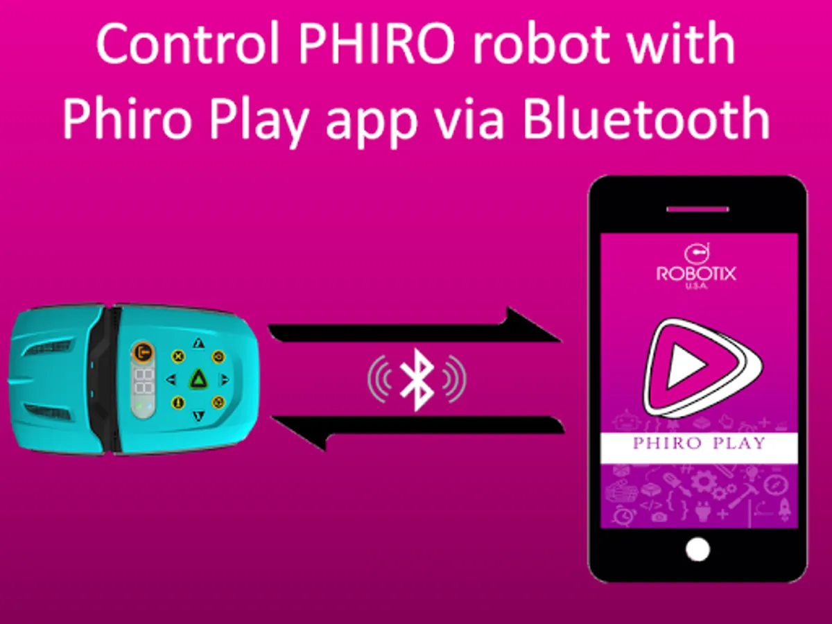 Each time when you use Phiro Play, please make sure to turn on Bluetooth on your Phiro Pro, by pressing the red button on top of the robot with the three rounded arrows two times, until the display area is illuminated in blue color (this switches your robot to its Bluetooth mode). Then, on your phone, after starting Phiro Play, select the right Bluetooth device containing the number printed on the underside of your robot.