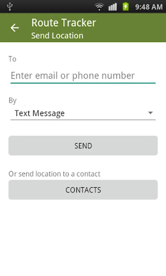 You can send your location by text message or email. The message sent will be a url link to 'maps.google.com' with latitude and longitude information. The app lets your enter a phone number or email address directly or choose one of your contacts to receive the message.
